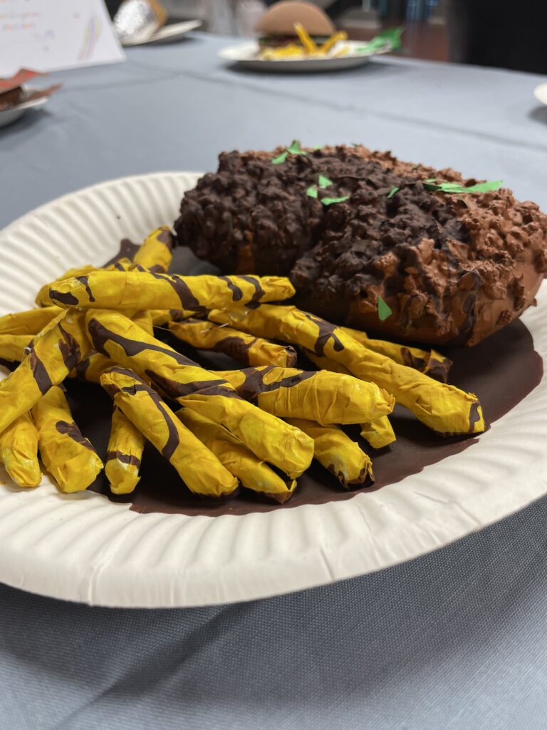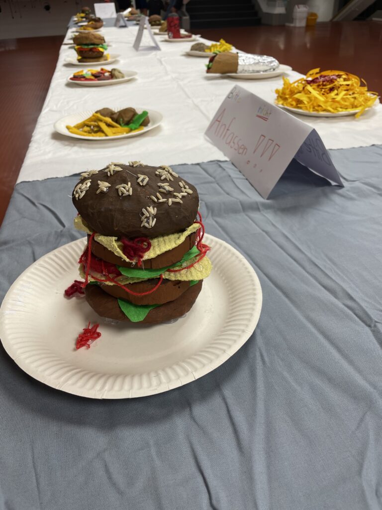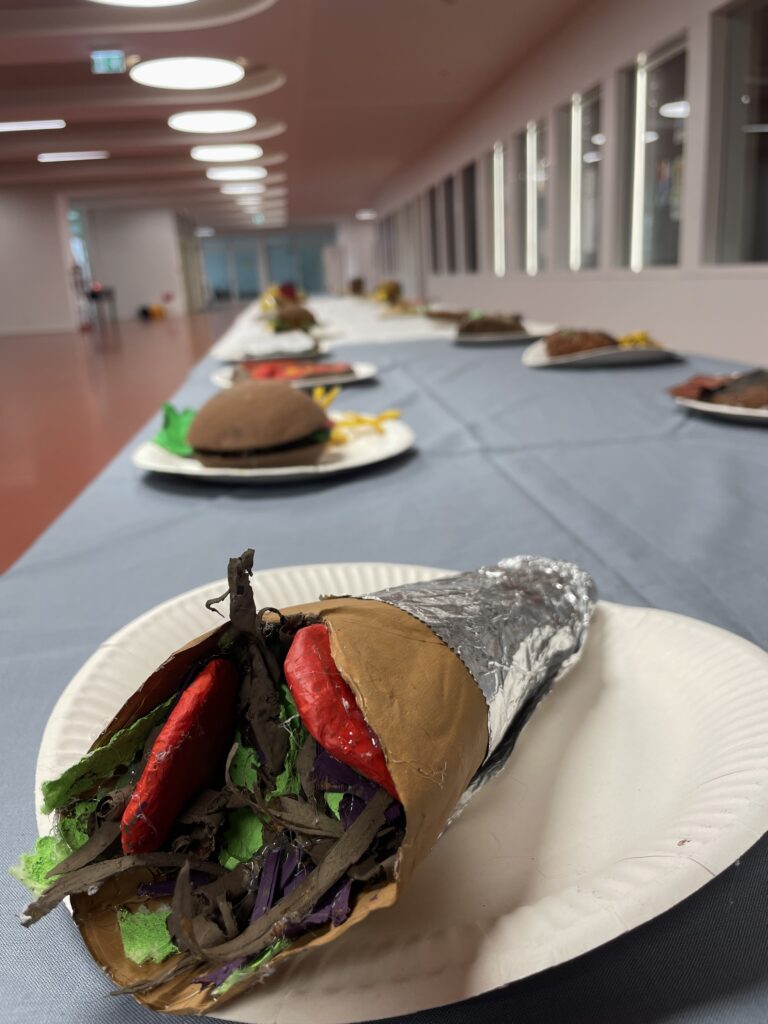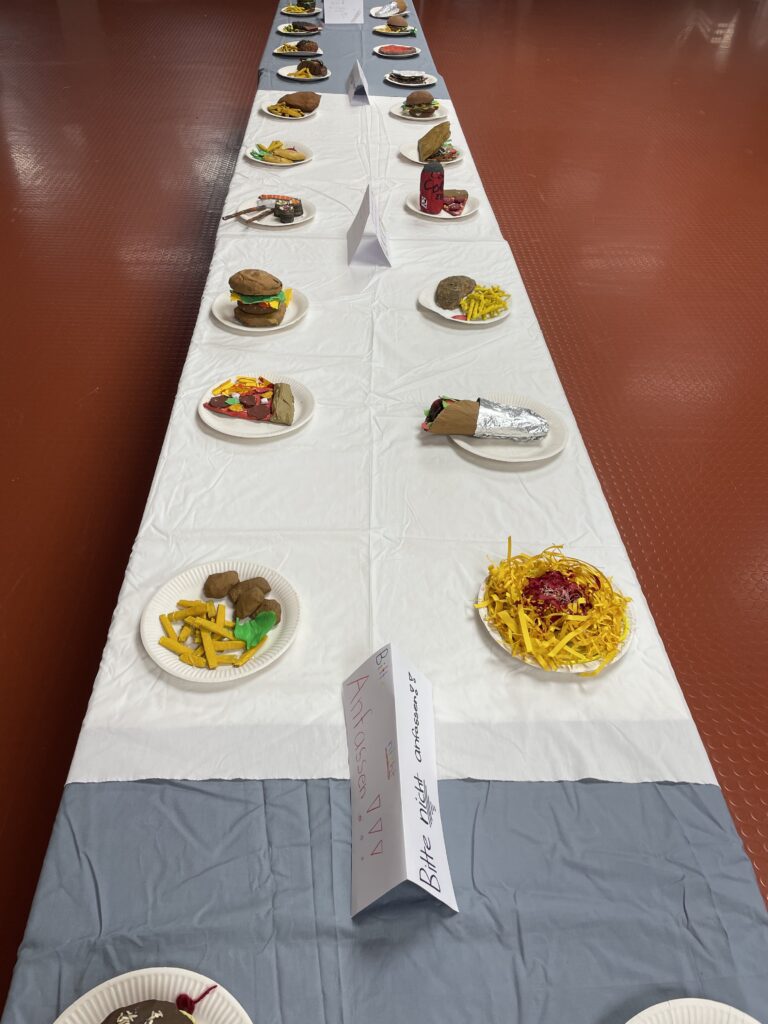 Auf den Spuren des schwedischen Künstlers Claes Oldenburg modellierte die Klasse 7b im Fach Bildende Kunst ihr eigenes Lieblingsessen als Fake Food. So entstanden Burger, Pommes, Döner, Schnitzel, Nudeln, Sushi und vieles mehr aus Pappmaschee, Schaumstoff, Schnur, Farbe und allem, was sich anbot, damit das Essen möglichst täuschend echt aussieht. Die Ergebnisse wurden an einer langen Tafel im Schulhaus präsentiert.