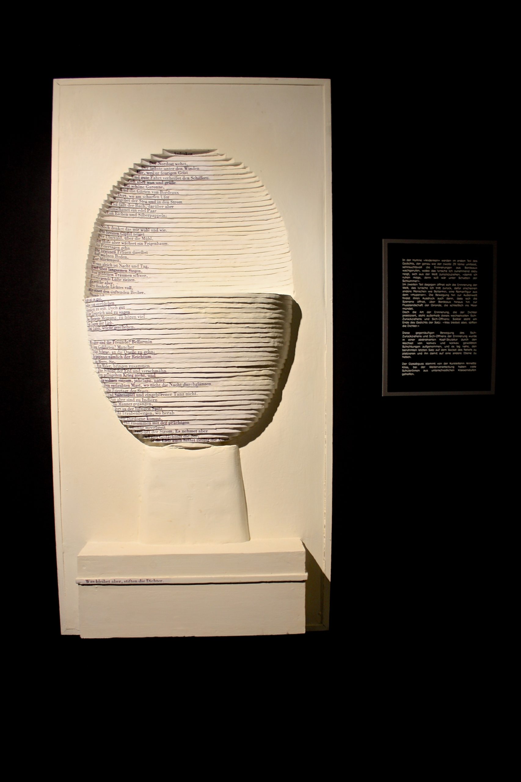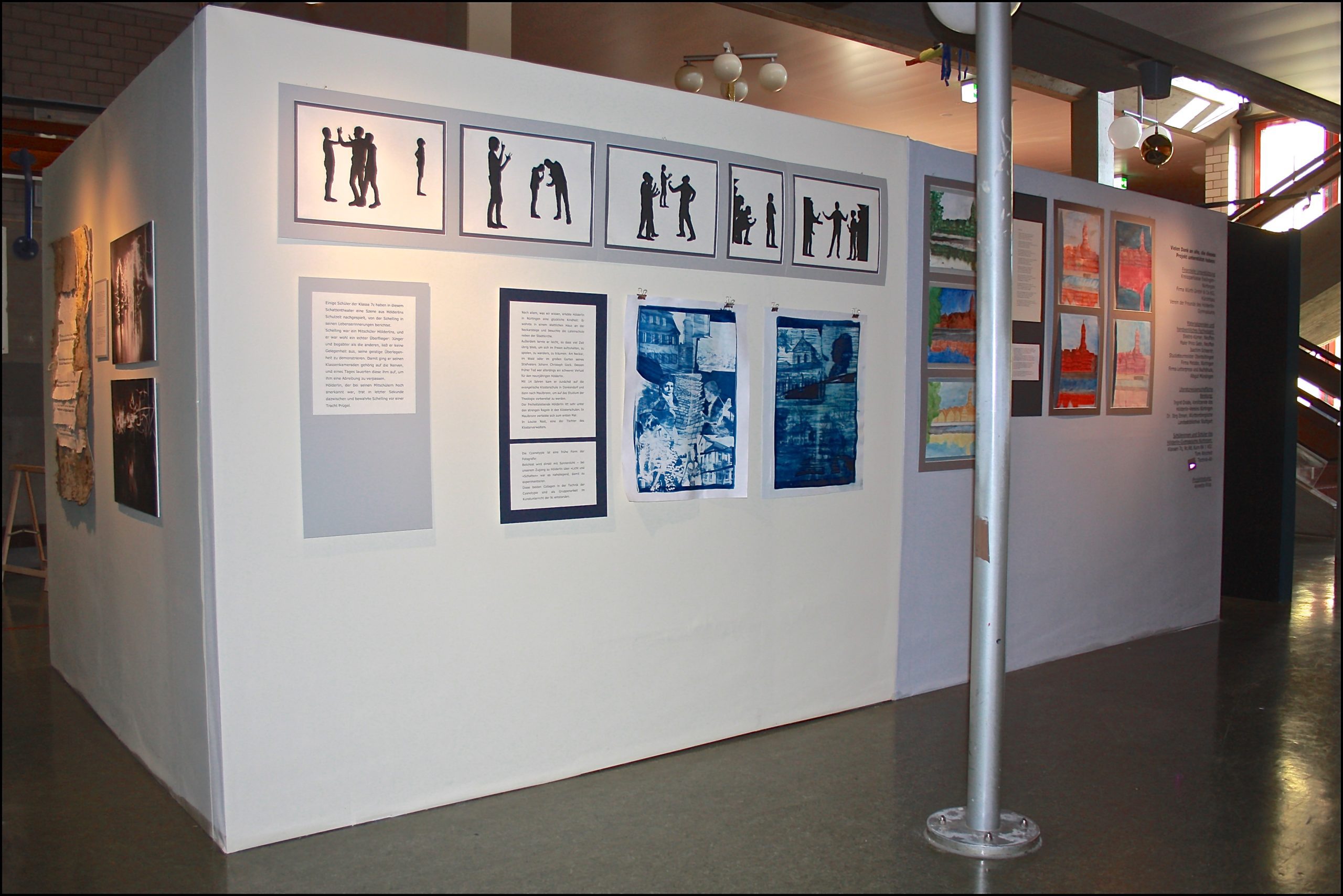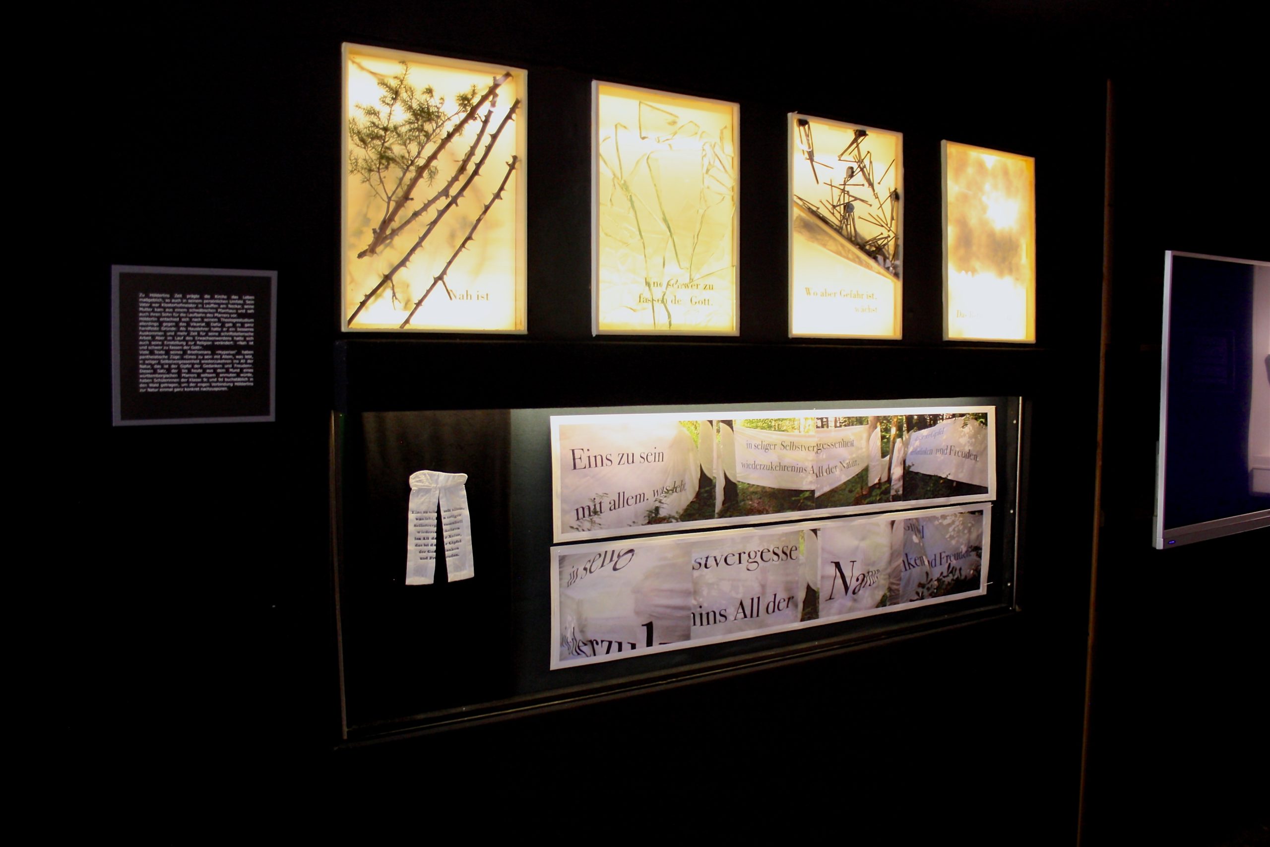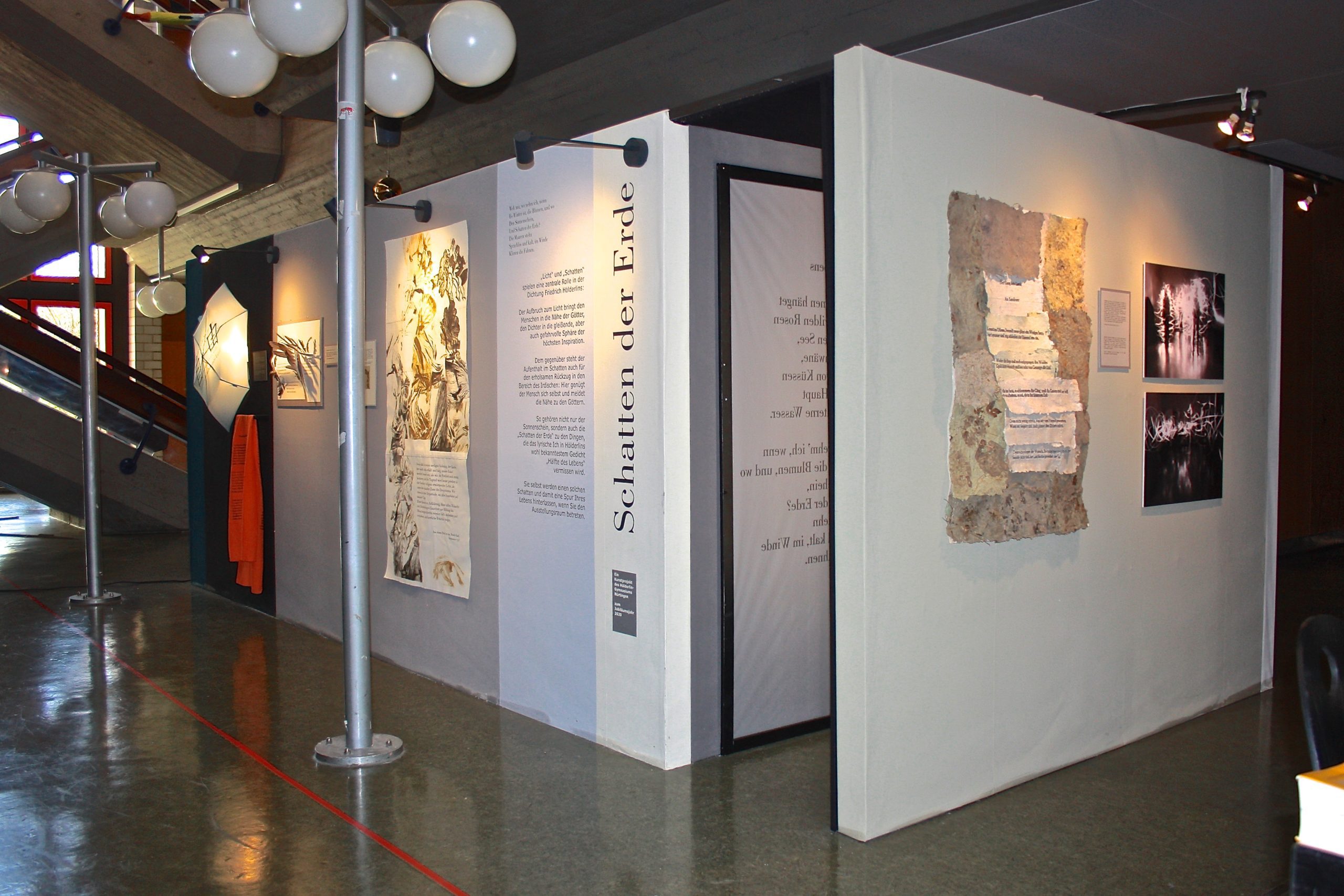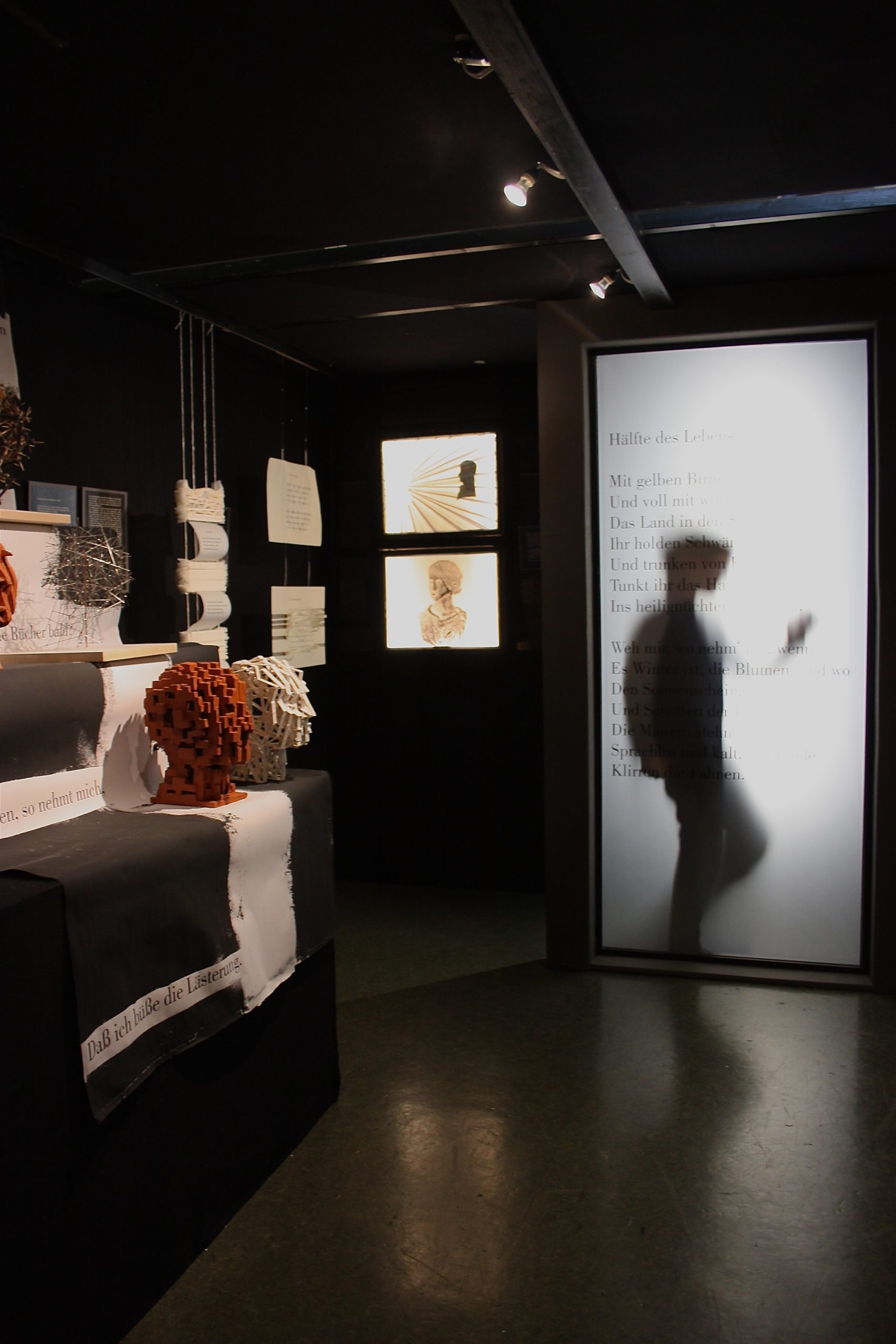 Es handelt sich dabei um ein Kunst-Projekt, das einen Zugang zu Hölderlins Dichtung über „Licht“ und „Schatten“ versucht. Dafür wurde eigens ein begehbarer, überdachter Raum gebaut, der Platz bietet für Projektionen, Lichtinstallationen und Videos. Auch auf den Außenwänden sind Objekte und zweidimensionale Arbeiten ausgestellt: Gezeichnete, gemalte und fotografierte Schatten…