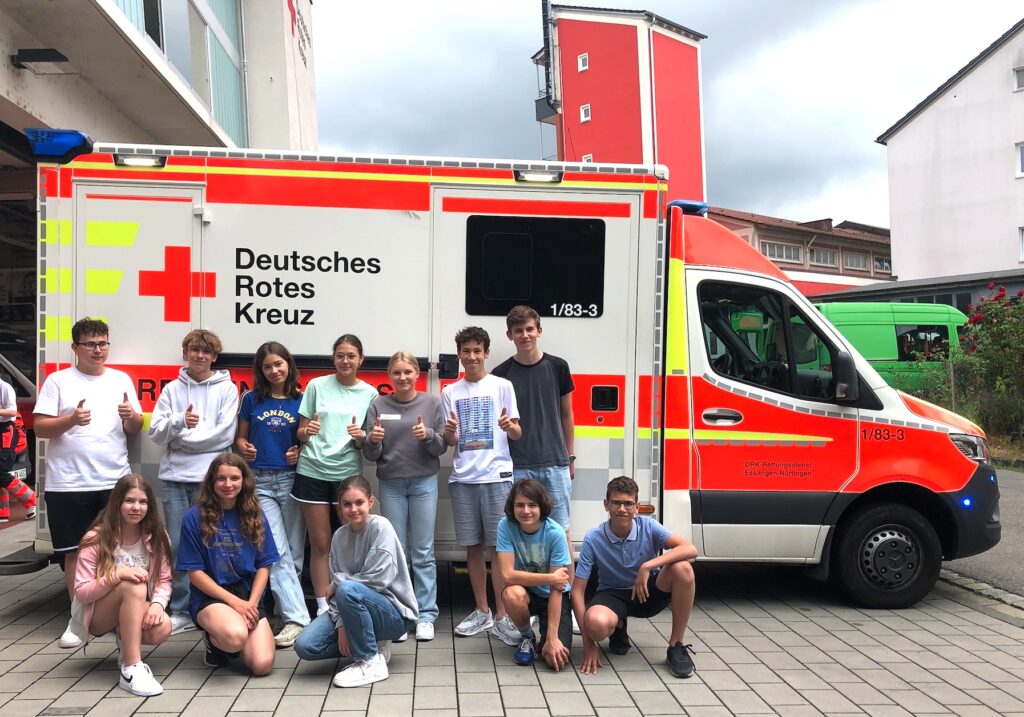 Wir, die Schulsanis, stehen in der Fahrzeughalle der DRK Rettungswache in Nürtingen und sind beeindruckt von der Vielzahl der verschiedenen Fahrzeuge, die im Notfall zum Einsatz kommen.