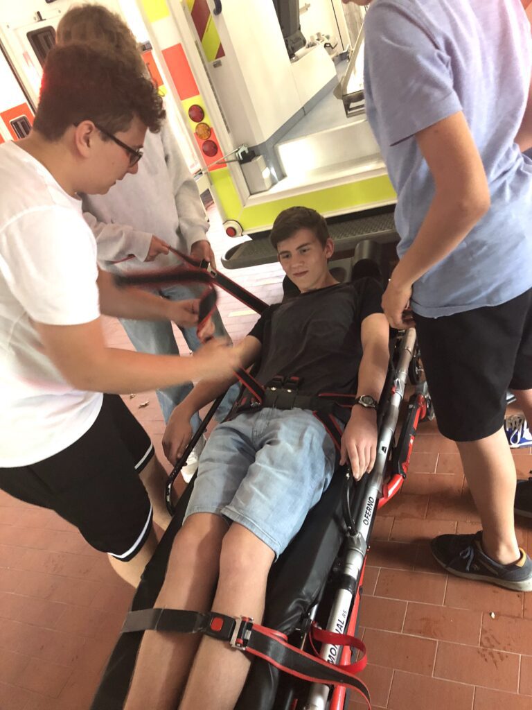 Wir gehen weiter durch die Halle und bleiben an einem Rettungstransportwagen stehen. Ein Mitarbeiter des DRKs öffnet die Tür und fährt die „Trage“ nach draußen. Auf ihr werden die Verletzten vom Unfallort zum Wagen transportiert. Durch das Bedienen von bestimmten Knöpfen lässt sich die Trage in der Höhe verstellen. Jonathan möchte gerne in die Rolle eines Verletzten schlüpfen und legt sich auf das Gestell. Nachdem Finjas, Lucas, Simon und Oskar die Fixierungsgurte fest angezogen haben, richten sie die Trage auf. „Ich kann mich gar nicht mehr bewegen“, stellt Jonathan fest. Das soll auch so sein, denn beim Aufrichten der Trage fühlt es sich ziemlich wackelig an. Nachdem die vier eine Probefahrt durch die Rettungswachenhalle gemacht haben, schnallen sie ihn erfolgreich wieder ab.