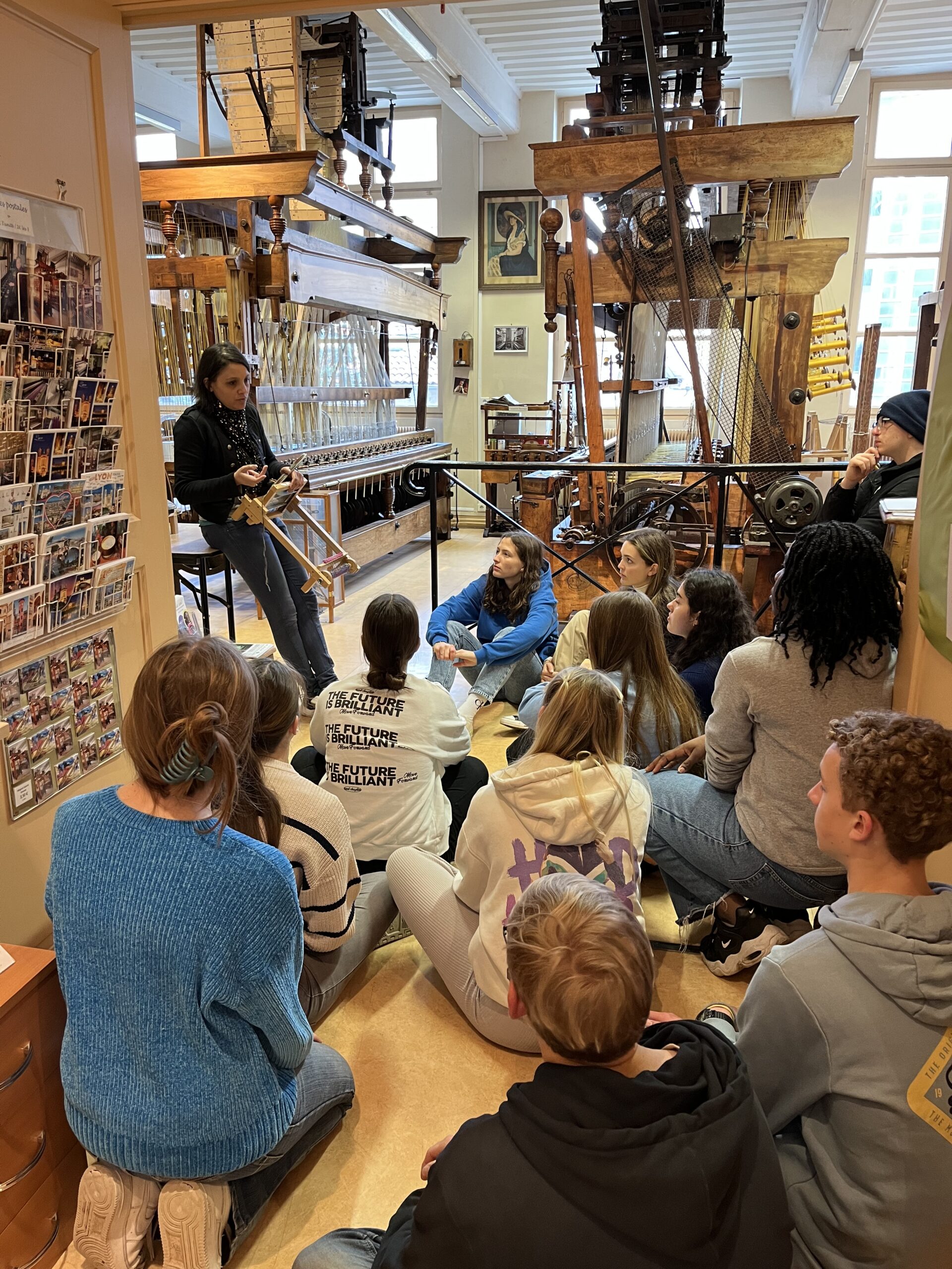 Am Montag besuchten wir ein Webatelier im Stadtviertel Croix-Rousse. Beim Betreten konnten wir etwas sehen, das wie alte Nähmaschinen aussah, welche sich von einer Seite des Raumes zur anderen erstreckten. Sie stiegen Meter über die Decke und die alten Holzornamente, die das Holz mit dem mechanischen Teil verbanden, der die Fäden zusammenführte, gaben ihnen eine majestätische Atmosphäre. Die Maschine revolutionierte die Welt, da sie mit Rollen arbeitete, die mit Punkten und gefüllten Zwischenräumen die Anfänge des Binärcodes darstellten. Nachdem uns die Leiterin die genaue Funktionsweise dieser Coderollen erklärt hatte, zog sie an einem großen Holzhebel, der die großen Arme der Maschine tanzen ließ, die Fäden verflochten und so ein wunderschön verziertes Tuch schufen. Später, zurück im Zentrum Lyons, hatten wir Freizeit. Um eine Pause einzulegen, setzte ich mich auf den Rand eines Gebäudes und schnappte mir mein Lunchpaket, um eine Pause einzulegen. Als wir fertig waren, teilten wir uns in zwei Gruppen auf und meine begann, eine kurze Strecke zum Anfang einer Brücke zu gehen. Dort waren 15 grüne Fahrräder zu erkennen, umgeben von drei Männern in orangefarbenen Westen. Eine E-Bike-Tour erwartete uns. Durch verschiedene Straßen fahrend, hielten wir u.a. auf dem Platz des Gemeindehauses. Nach einem weiteren Halt vor einem alten Krankenhaus kehrten wir zum Ausgangspunkt zurück, wo wir mit der anderen Hälfte wechselten. Bei einer Walkingtour durch die Altstadt Lyons, dem Vieux Lyon, passierten wir u.a. antike römische Ruinen und eines der ältesten Häuser Lyons.