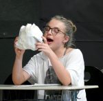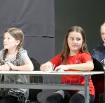 Die Theater-AG unter der Leitung von Damaris Raiser, Charis Hager und Tobias Flick begeisterte das Publikum in der zweiten Hälfte des Abends mit dem Stück „Die magische Bibliothek“: Was geschieht, wenn Jugendliche ein Referat über Hölderlin vorbereiten müssen? Reichen da ein paar Clicks im Internet oder ist die geheimnisvolle Bibliothek unter dem HöGy nicht viel geeigneter? Die Rechnung könnte einfach aufgehen: ein alter Dichter, alte Bücher und ein alter schrulliger Bibliothekar, der ihnen weiterhilft. Die zwei Schülerinnen ahnen jedoch nicht, was sie erwartet, als sie in die schummrigen Gewölbe der mysteriösen und selten besuchten Bücherwelt hinabsteigen. Eigentlich haben sie angesichts von Digitalisierung und Internet mit Büchern nicht viel am Hut. Und so scheinen sich Welten zwischen ihnen und dem grauhaarigen, geschwollen daherredenden Bücherwurm aufzutun. Der alte kauzige Bibliothekar, überzeugend gespielt von Lehrer Tobias Flick, erzählt phantastisch-schauerliche Geschichten, die sich den Zuschauern als kurze Szenen darbieten. Er weiß von einem Geist, der in der Bibliothek herumspukt, genauer gesagt einem Schutzgeist der oft bedrohten und vergessenen Bücher. Dieser Geist erschreckt unbedarfte Fünftklässler und jagt frisch gebackenen Abiturienten Schauer über den Rücken, die mit Schiller und anderen Klassikern „abrechnen“ und deren Bücher zerstören wollen. Auch einbrechende Ganoven bringt er durch Zauberkräfte mit „beißenden“ Büchern zur Strecke.