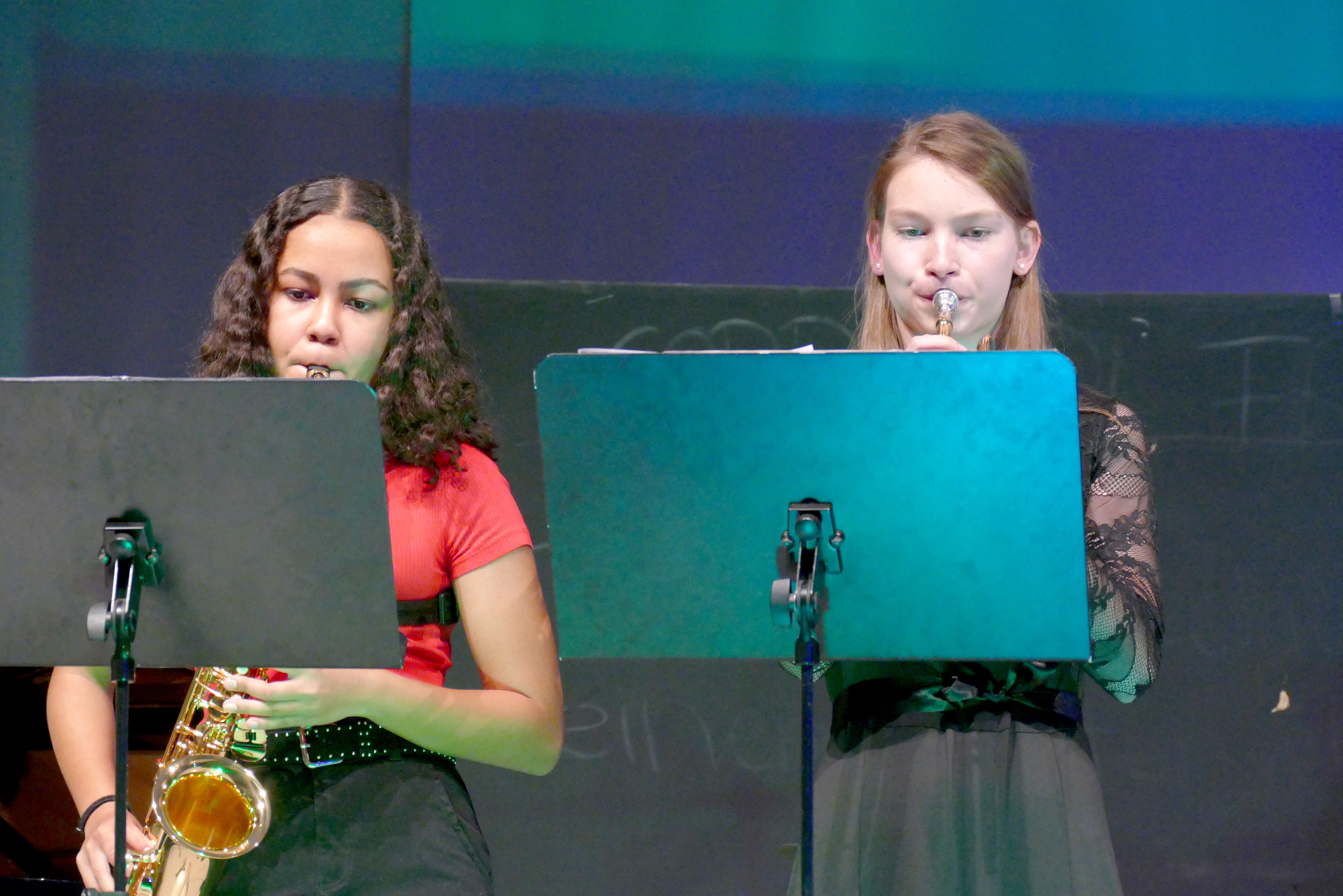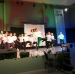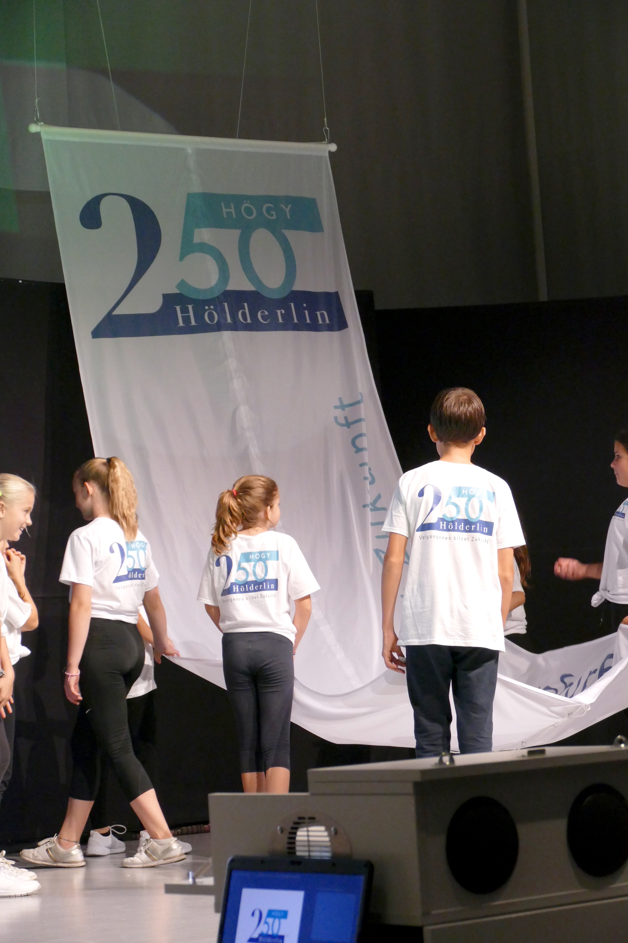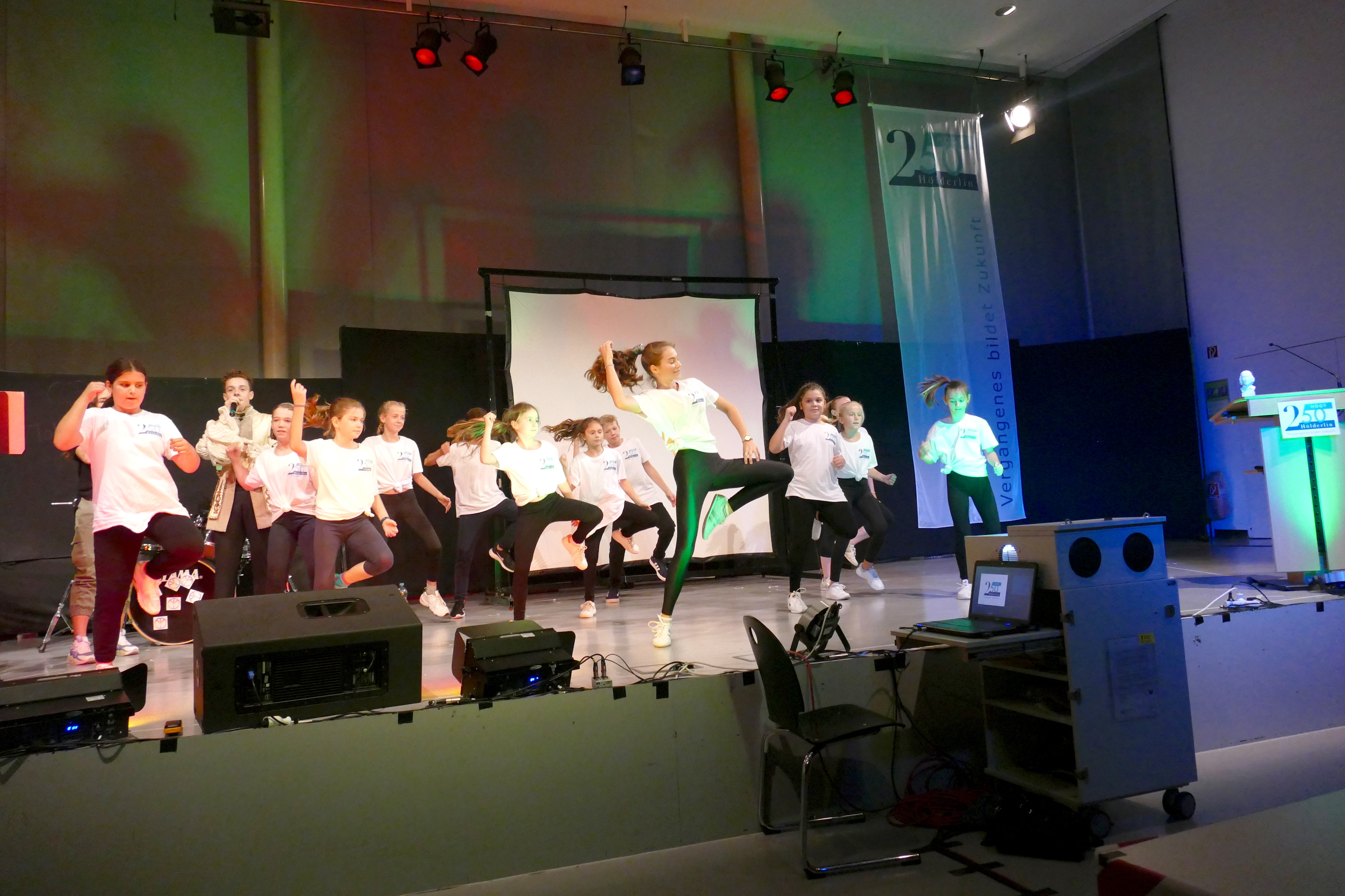 Ein neu erweckter Hölderlin, eindrücklich gespielt von Lucas Neps, führte erstaunlich lebendig als Moderator durch den Abend und ließ neben Oberbürgermeister Dr. Fridrich auch viele Zeitzeugen zu Wort kommen, die das HöGy in den letzten Jahrzehnten hautnah erlebt hatten. Ehemalige Schüler und Lehrer erzählten von Matrizen, die als durchdringend „duftende“ Klassenarbeiten in Erinnerung bleiben und von einer Telefonzelle, die damals direkt am HöGy stand. Von beidem können sich heutige Kinder und Jugendliche wahrscheinlich ebenso wenig ein Bild machen wie von Kassetten im Sprachlabor oder im „Walkman“. Begleitet von Tanzeinlagen umrahmte die eigens zum Jubiläumsjahr gegründete HöGy-Band unter der Leitung von Kevin Hirel die Veranstaltung beschwingt musikalisch mit Liedern aus den letzten fünf Jahrzehnten: von ABBAs „Money, Money, Money“ über „Sweet Dreams“ von Eurythmics bis hin zu Hits der Gegenwart. Und so passte das Motto auf der Jubiläumsfahne über der Bühne: „Vergangenes bildet Zukunft“.