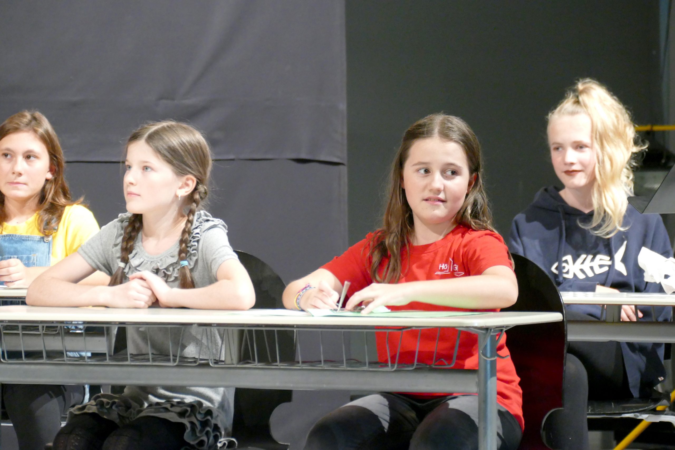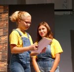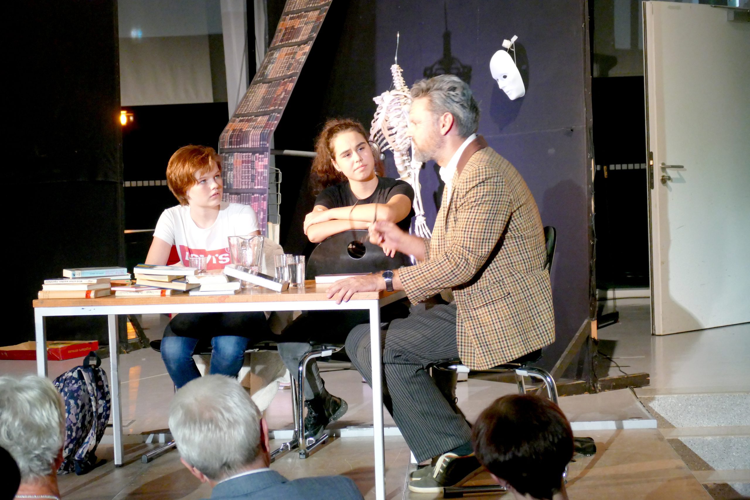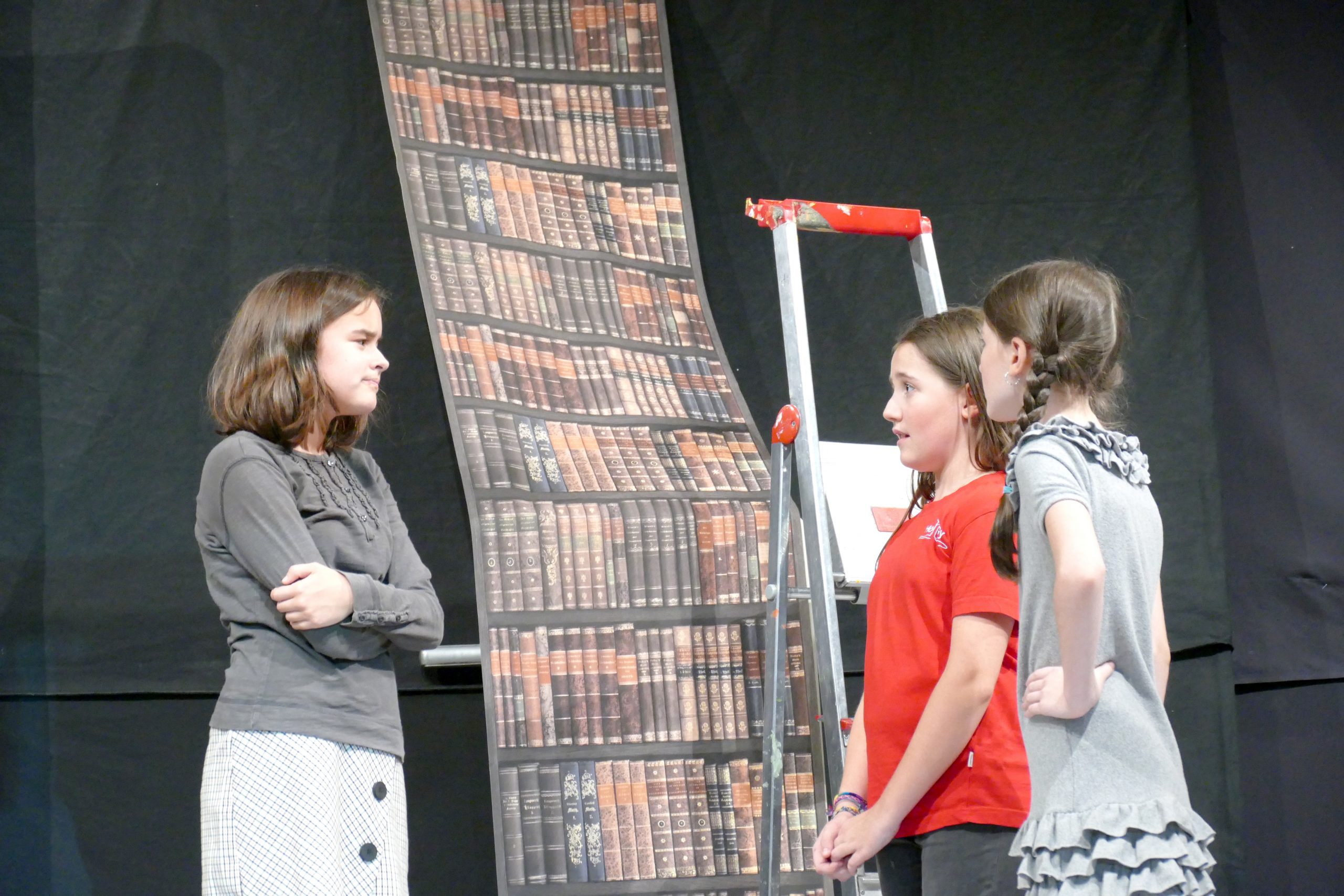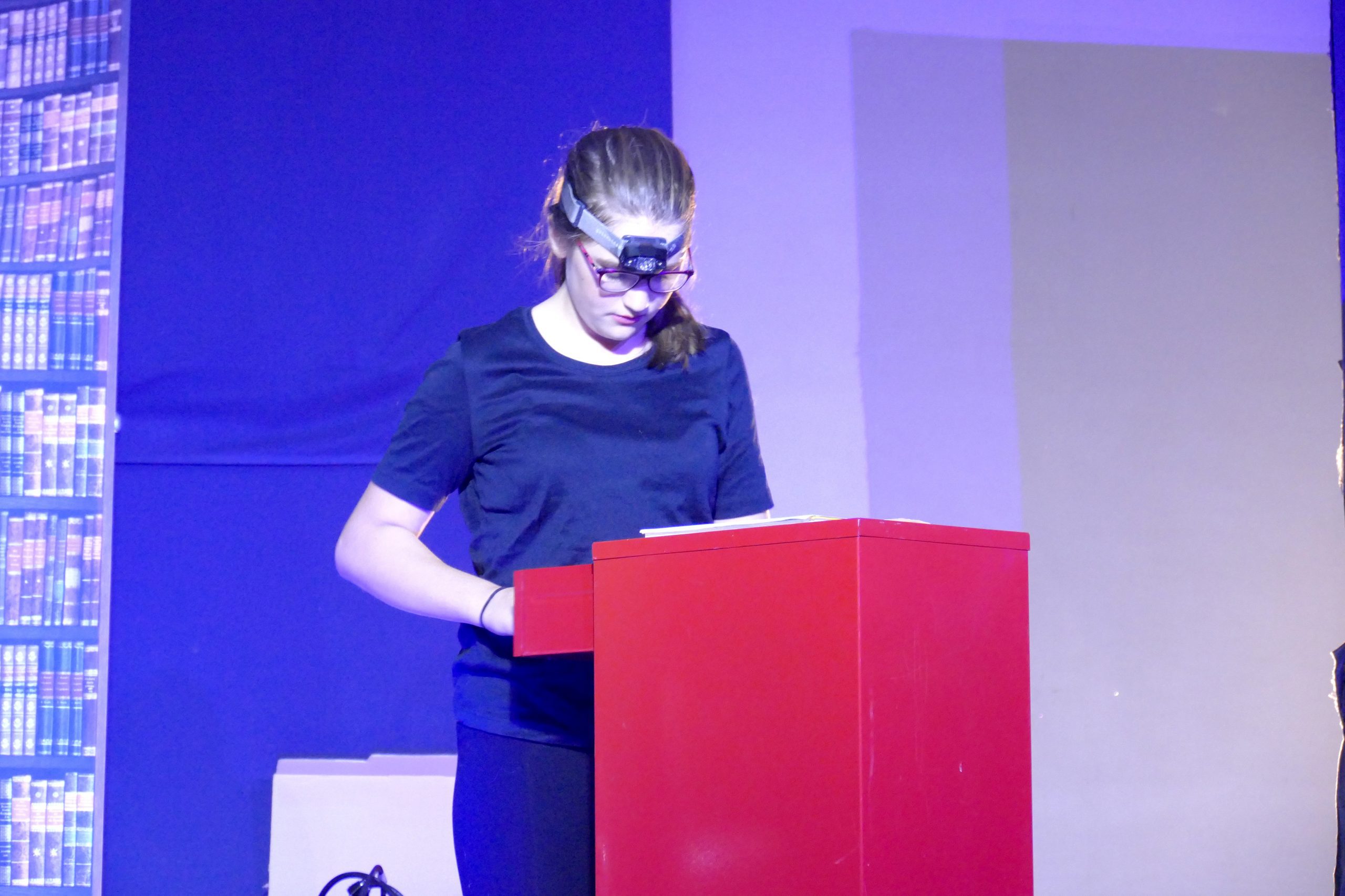 Die Theater-AG unter der Leitung von Damaris Raiser, Charis Hager und Tobias Flick begeisterte das Publikum in der zweiten Hälfte des Abends mit dem Stück „Die magische Bibliothek“: Was geschieht, wenn Jugendliche ein Referat über Hölderlin vorbereiten müssen? Reichen da ein paar Clicks im Internet oder ist die geheimnisvolle Bibliothek unter dem HöGy nicht viel geeigneter? Die Rechnung könnte einfach aufgehen: ein alter Dichter, alte Bücher und ein alter schrulliger Bibliothekar, der ihnen weiterhilft. Die zwei Schülerinnen ahnen jedoch nicht, was sie erwartet, als sie in die schummrigen Gewölbe der mysteriösen und selten besuchten Bücherwelt hinabsteigen. Eigentlich haben sie angesichts von Digitalisierung und Internet mit Büchern nicht viel am Hut. Und so scheinen sich Welten zwischen ihnen und dem grauhaarigen, geschwollen daherredenden Bücherwurm aufzutun. Der alte kauzige Bibliothekar, überzeugend gespielt von Lehrer Tobias Flick, erzählt phantastisch-schauerliche Geschichten, die sich den Zuschauern als kurze Szenen darbieten. Er weiß von einem Geist, der in der Bibliothek herumspukt, genauer gesagt einem Schutzgeist der oft bedrohten und vergessenen Bücher. Dieser Geist erschreckt unbedarfte Fünftklässler und jagt frisch gebackenen Abiturienten Schauer über den Rücken, die mit Schiller und anderen Klassikern „abrechnen“ und deren Bücher zerstören wollen. Auch einbrechende Ganoven bringt er durch Zauberkräfte mit „beißenden“ Büchern zur Strecke.
