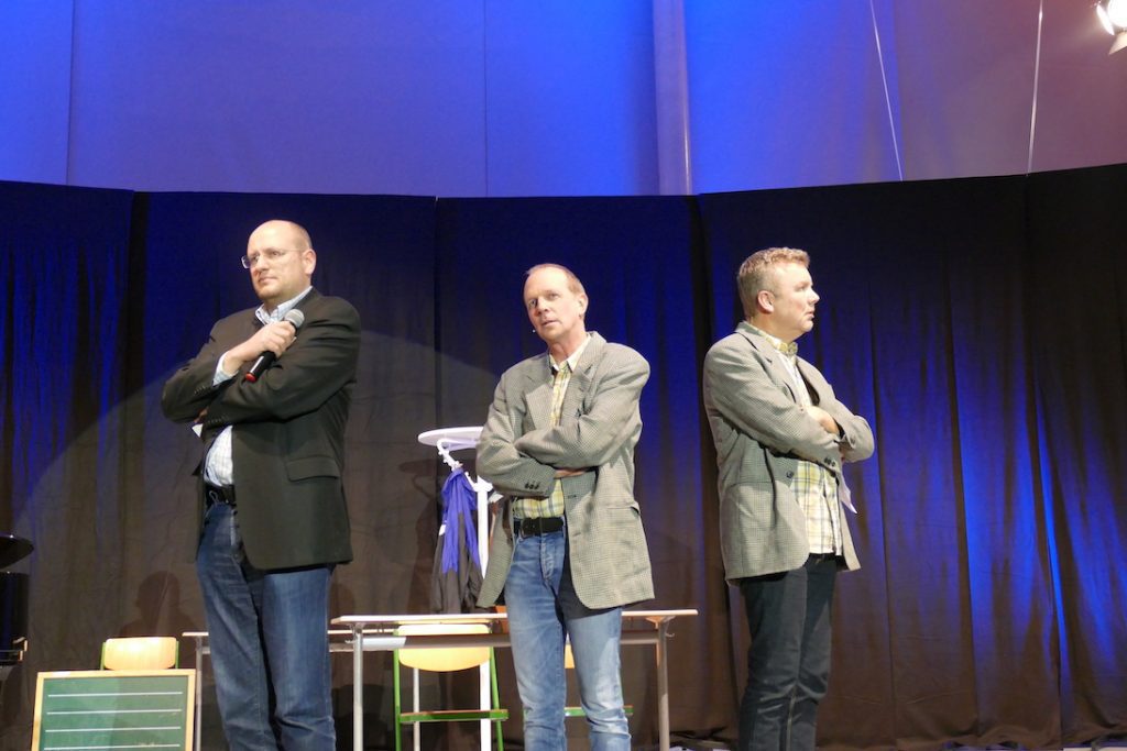 So jonglierten die Kabarettisten souverän mit Vorurteilen über den Lehrerberuf und warfen sich, musikalisch begleitet von Andreas Reif am Klavier, mit Wortakrobatik die Bälle zu: sei es, wenn es um die personifizierte Widerborstigkeit in Gestalt des berüchtigten Schülers Thorben ging, der die Lehrer im Schullandheim auf die Palme bringt oder dessen Vater, der auf herrliche Weise in pointenreichem Redeschwall am Elternsprechtag am Lehrer vorbeiredet. Ist es aus Sicht einer besorgten Mutter nicht viel ertragreicher, wenn sich die Tochter nachmittags mit „gewaltfreiem Töpfern“ beschäftigt als Hausaufgaben zu erledigen? Und könnte ein neues Schulfach „Denken“ im unübersichtlichen Dschungel aus Kompetenzen und Niveaudifferenzierung das Schulsystem auf Vordermann bringen?