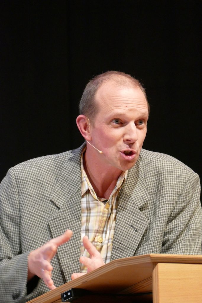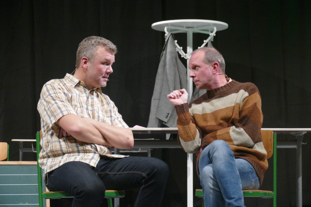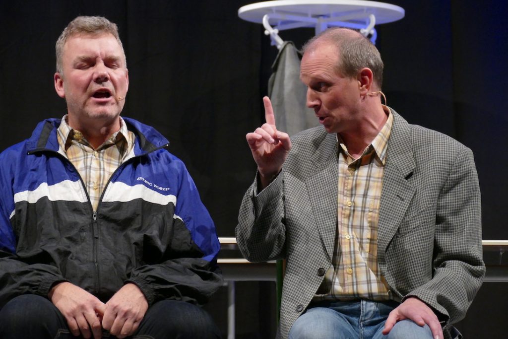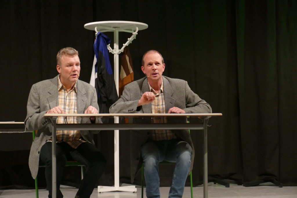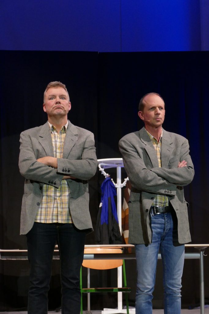 Was kommt dabei heraus, wenn ein Mathelehrer auf einen Deutschlehrer trifft und beide auf einer Kabarett-Bühne ideenreich im Potpourri aus Klischees über den Schulbetrieb rühren? Die Zuschauer im ausverkauften Festsaal des Hölderlin-Gymnasiums konnten sich davon auf äußerst unterhaltsame Weise überzeugen. Mit ihrem Programm „Abendschule“ lieferte sich das Duo Ulrich Munz und Martin Ruppenthal passgenaue, teils im wahrsten Sinne des Wortes atemberaubende Rededuelle – gegeneinander, miteinander oder synchron und immer aus verschiedenen Perspektiven: Referendare, Schulleitung, Schüler, Eltern, aber auch das System aus Ministerium und Referenten – alle bekamen ihr Fett ab. Und natürlich die Lehrer! Schließlich wissen die beiden nur zu gut, wie Schule tickt, Ulrich Munz sogar direkt vor Ort am HöGy in Nürtingen, wo er neben Deutsch noch Französisch sowie Literatur und Theater unterrichtet.
