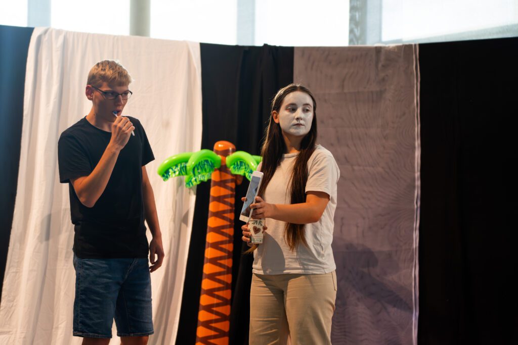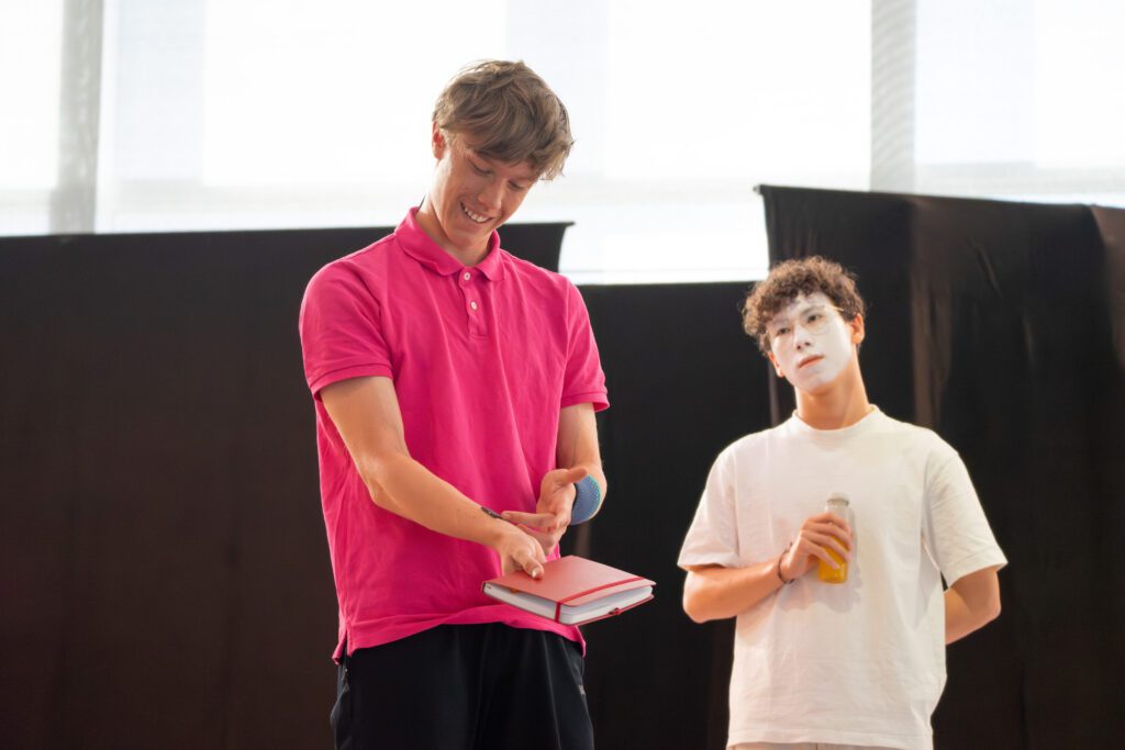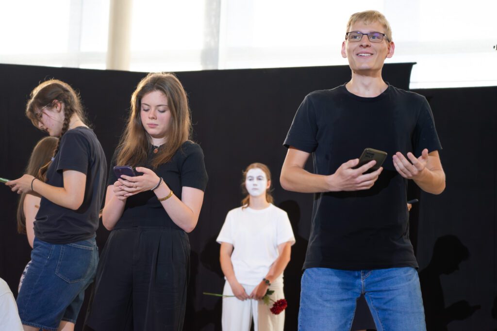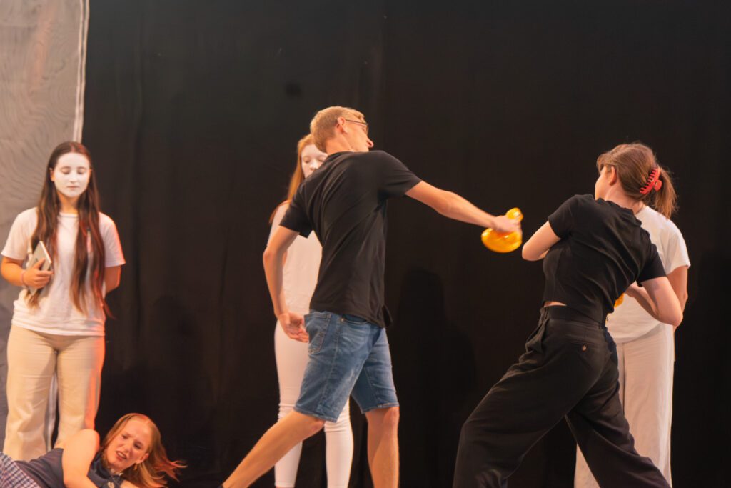Besonders spannend war die Arbeitsweise des Kursleiters Herrn Flick: Um Szenen mit synchronen Sprechanteilen präzise einzustudieren, nutzte er beispielsweise Schnipsen. So lernten die Schauspielerinnen und Schauspieler, Texte synchron zu sprechen: Zunächst unterstützt durch das akustische Signal, später auch eigenständig im richtigen Tempo. Dieses gemeinsame Üben schuf ein starkes Gefühl für Timing und Rhythmus.