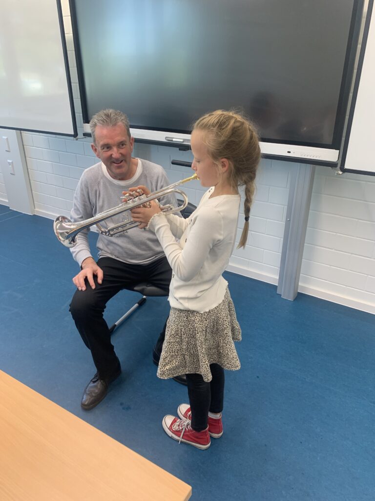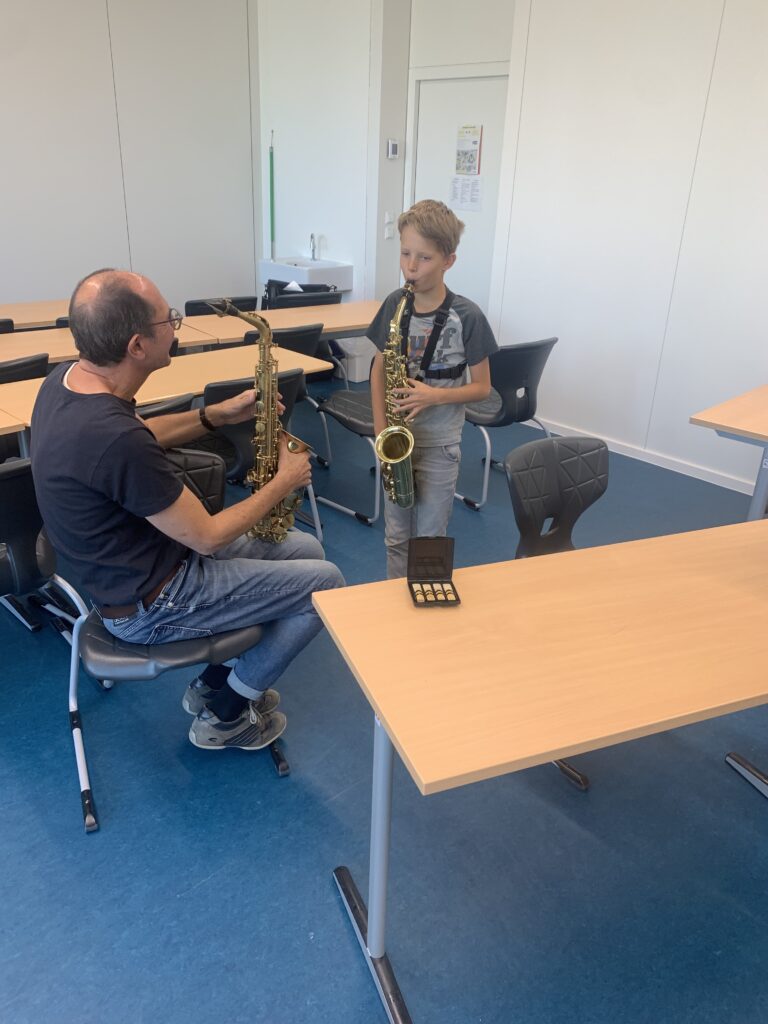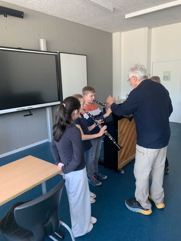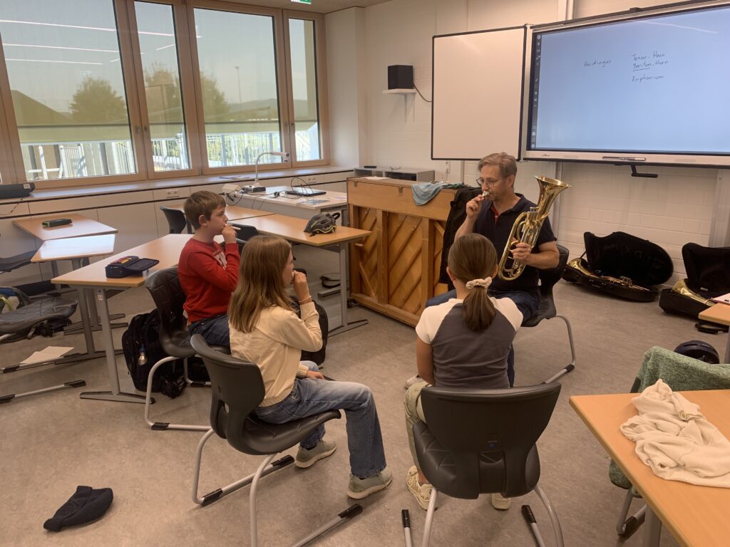 Bevor die Instrumente endgültig zugeteilt werden, dürfen die Schüler*innen bis zu den Herbstferien im wöchentlichen Wechsel alle angebotenen Instrumente (Klarinette, Saxophon, Trompete, Baritonhorn) ausprobieren.