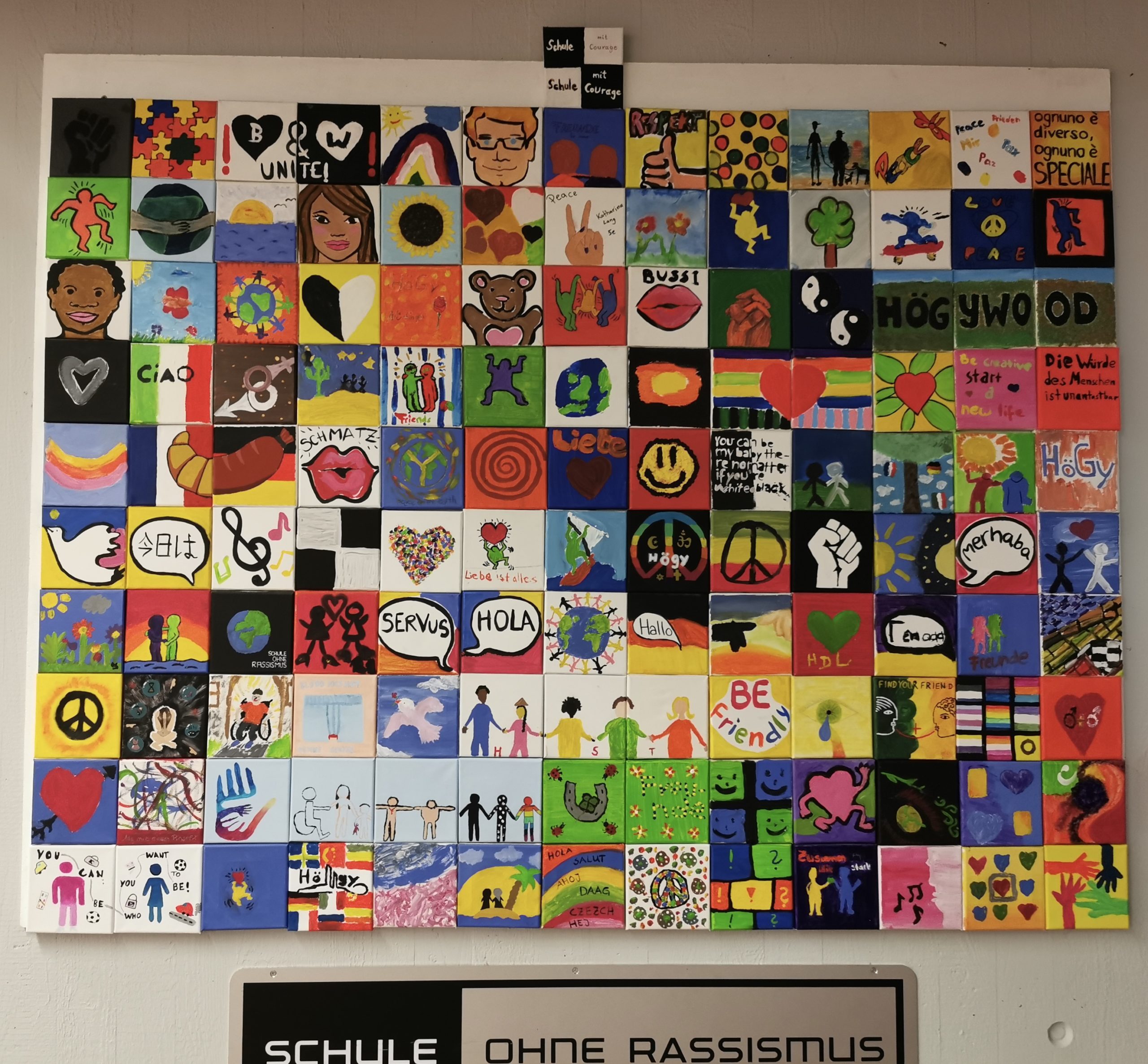 Seit 2011 ist das HöGy Teil des Projekts „Schule ohne Rassismus – Schule mit Courage“. Im Rahmen dieses Projekts arbeitete der SoD-AK (Schule ohne Diskriminierung) in den vergangenen Wochen mit der Klasse 9e zusammen. Nach einer Einführung in das Thema „Diskriminierung“, in der die Schülerinnen und Schüler sich Gedanken darüber gemacht haben, welche Formen von Diskriminierung es gibt, stand dann die Kreativität im Mittelpunkt. Gemeinsam mit ihrer Kunstlehrerin Frau Raiser ging die Klasse auf Motivsuche, um auf kleinen Leinwänden zu zeigen, wie Vielfältig unsere Schule und unsere Gesellschaft ist. Mit vielen unterschiedlichen Ideen, Interpretationen und Umsetzungen des Themas, entstanden ganz verschiedene tolle Kunstwerke. Die Leinwände wurden zusammengesetzt und fanden ihren Platz direkt neben dem Haupteingang unserer Schule. Hier ergänzen sie gut sichtbar das Kunstwerk, das schon vor einigen Jahren bei der gleichen Aktion entstanden ist. Für alle sichtbar zeigt sich hier nun, welch ein schönes Bild die Vielfalt an unserer Schule ergibt.