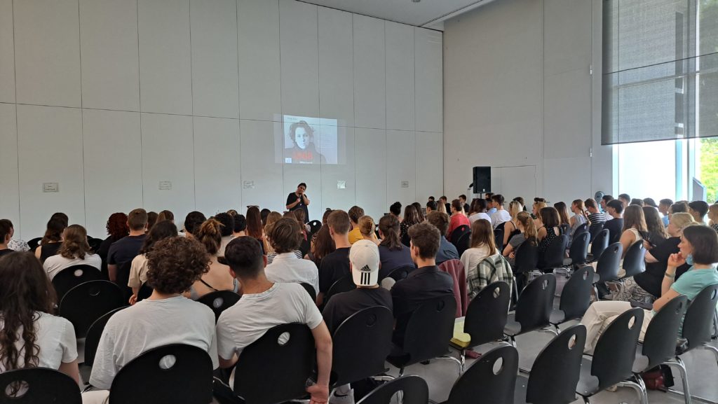 Mit beschwingter Stimme und inspirierendem Auftreten hieß Nadja Klier die Kursstufe 2 willkommen, um uns ihre Geschichte als Zeitzeugin der DDR zu erzählen und um uns das Leben im damals zweigeteilten Deutschland näherzubringen.