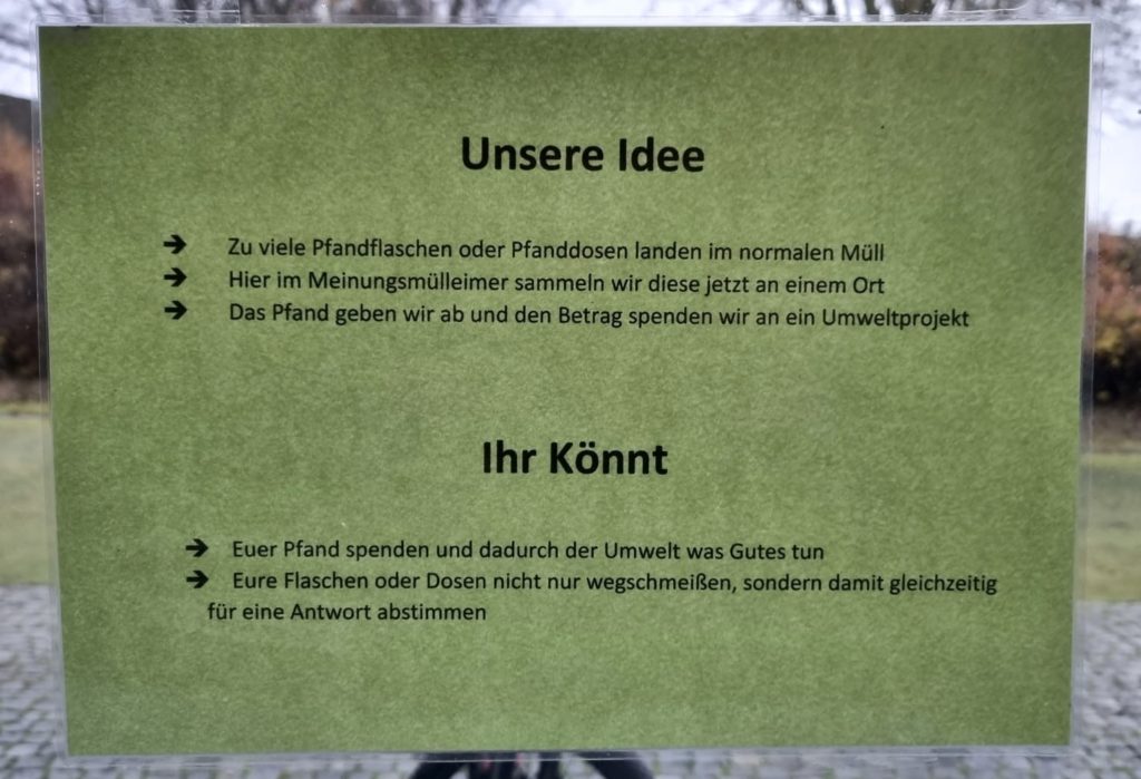 Zu viele Pfandflaschen und Pfanddosen landen im normalen Müll. Um das zu verhindern, erarbeitete der Umwelt AK eine interessante Lösung. Nun könnt ihr mit eurem Pfand über wechselnde Fragen abstimmen, wie z.B. über den besten Kinosnack.