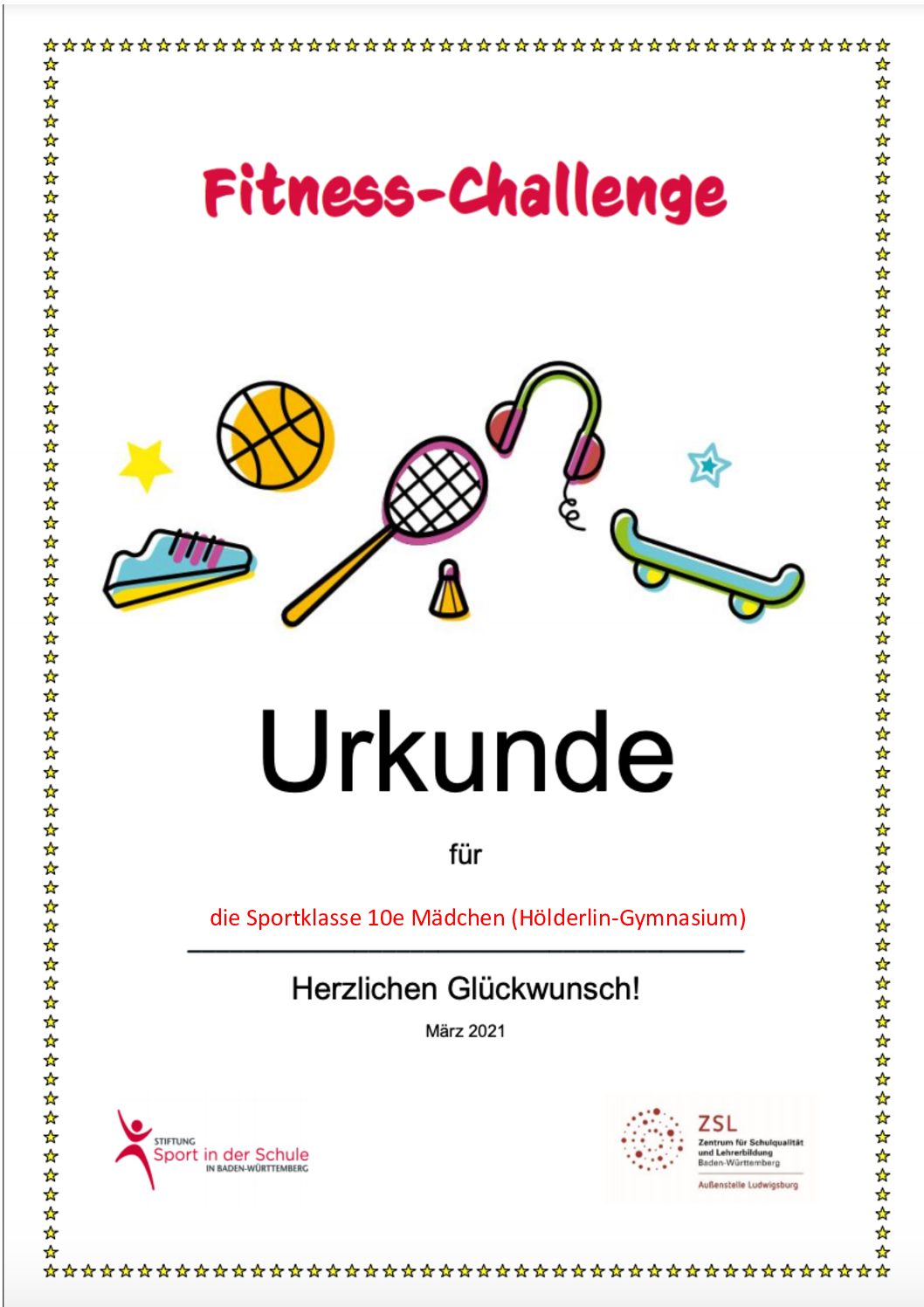 Aufgrund der pandemiebedingten Einschränkungen entfällt momentan leider wichtige Bewegungszeit für Kinder und Jugendliche. Aus diesem Grund hat das Kultusministerium Baden-Württemberg zusammen mit der Stiftung Sport in der Schule eine Fitness-Challenge für Schülerinnen und Schüler entwickelt, die dazu animieren sollte, sich mindestens 60 Minuten pro Tag zu bewegen.