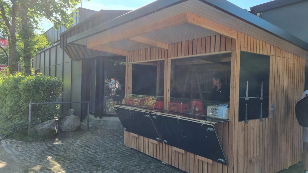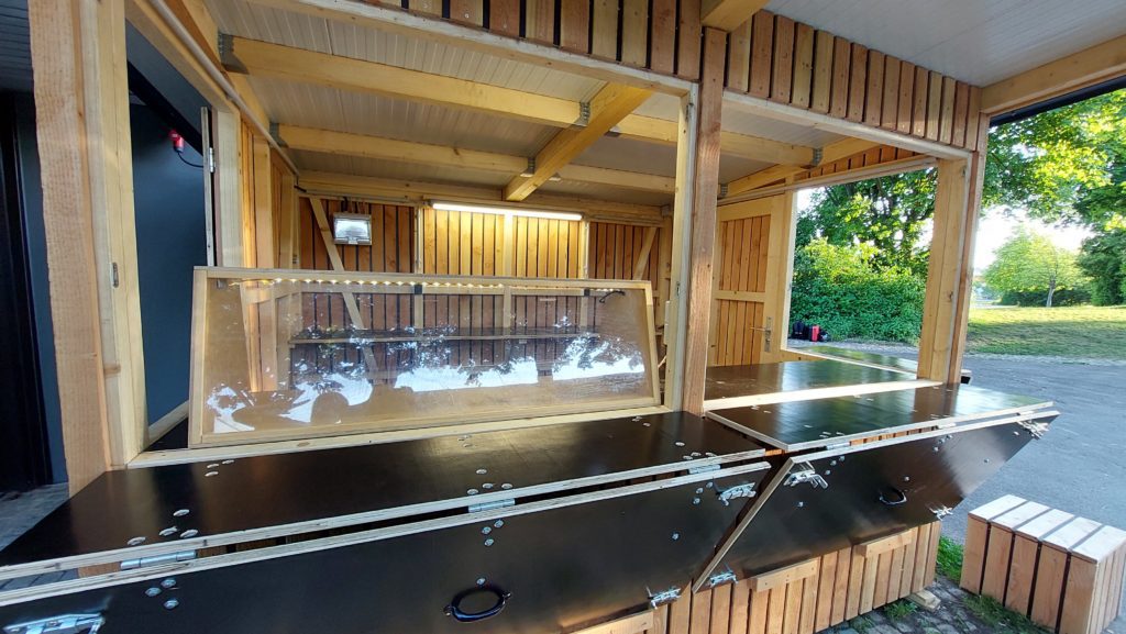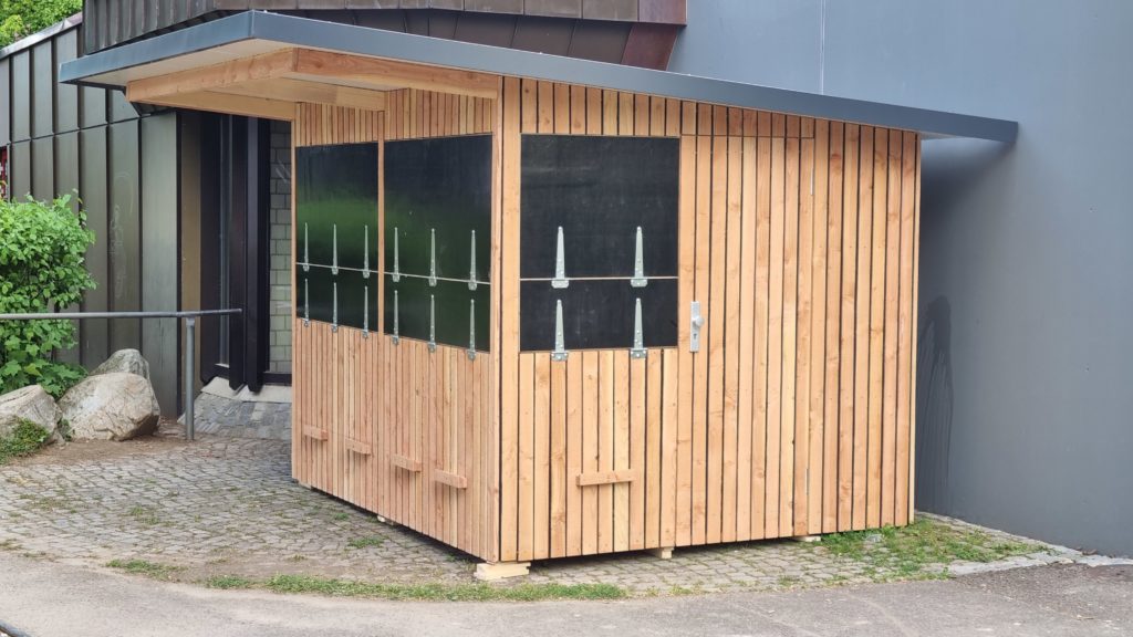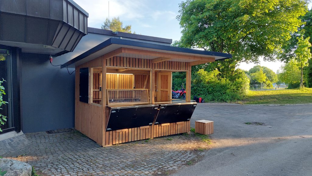 Zimmerer der Philipp-Matthäus-Hahn-Schule in Nürtingen haben unter Anleitung ihres Lehrers eine Verkaufshütte aus Holz für das HöGy angefertigt und gegenüber der Containern aufgestellt. Die Hütte wurde auch elektrisch ausgestattet, sodass für Beleuchtung und Anschlussmöglichkeiten für z.B. Waffeleisen, Crêpeseisen, etc. gesorgt ist.