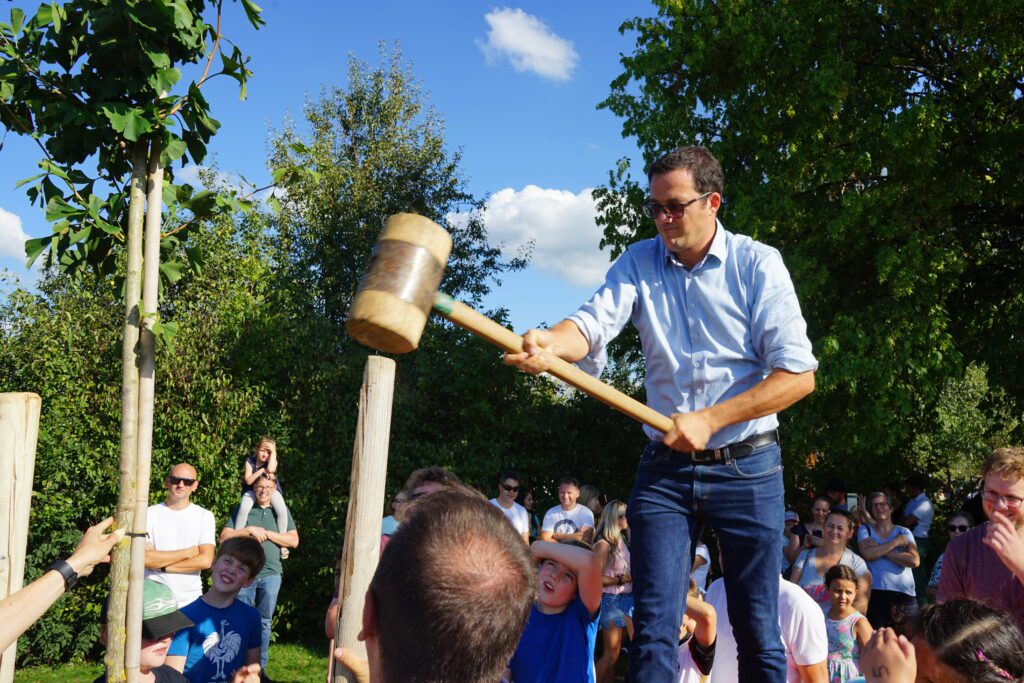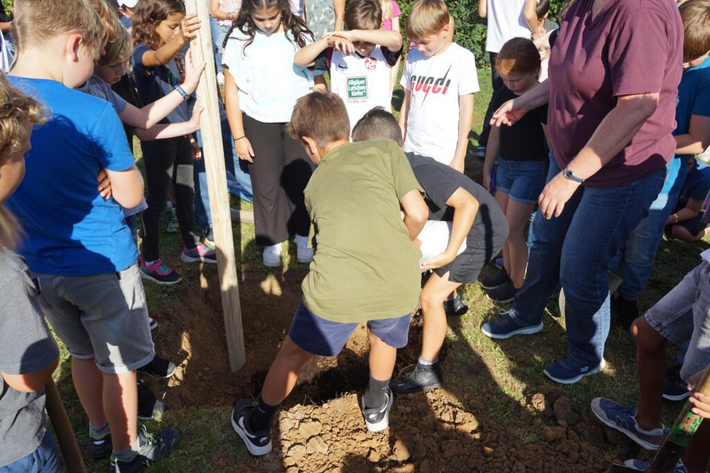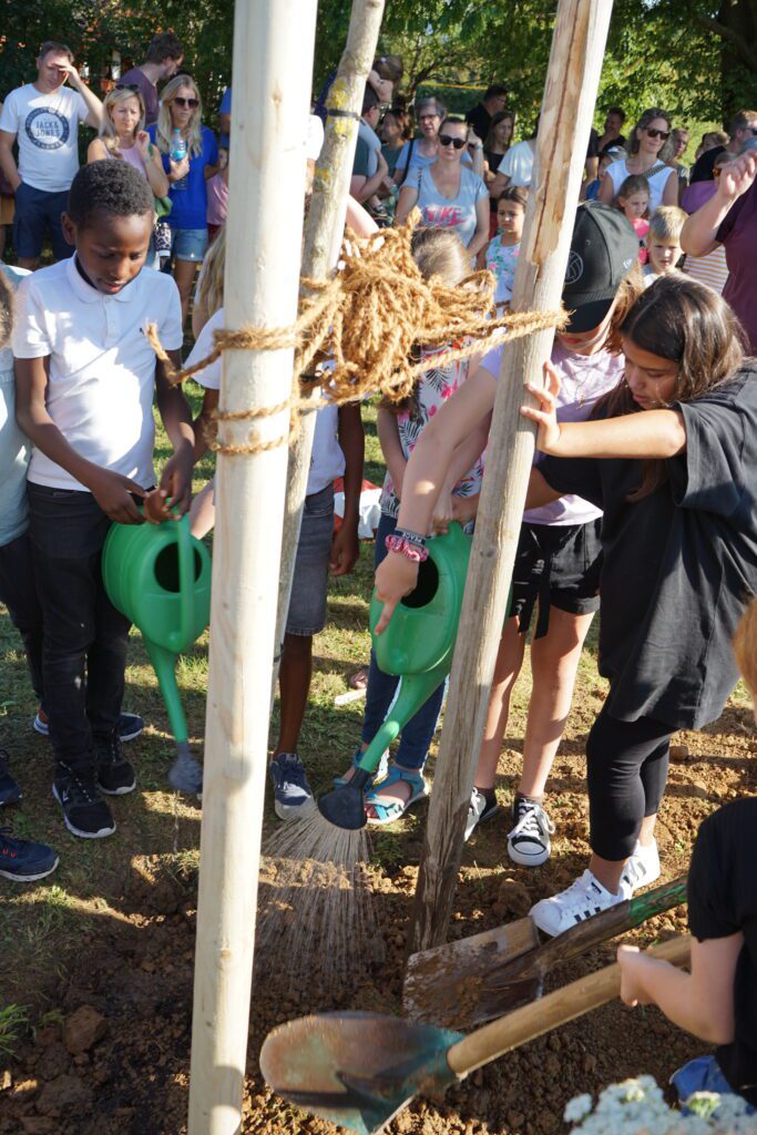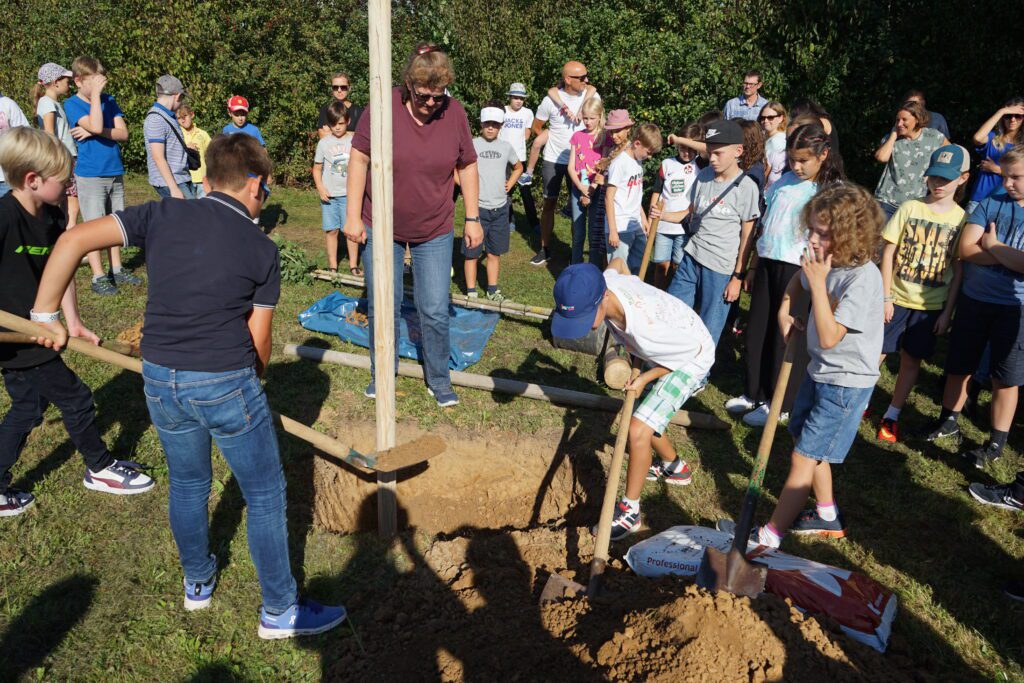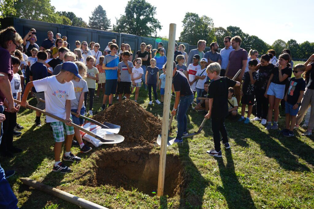 Es gehörte schon eine gehörige Kraftanstrengung dazu, den nicht mehr ganz kleinen Ginkgo in das ausgehobene Loch in der Nähe des HöGy-Sportplatzes zu hieven. Den neuen Fünftklässlerinnen und Fünftklässlern blieb es vorbehalten, die Wurzeln mit Erde zu bedecken und dem Baum Halt zu geben. Denn schließlich ist es ihr Jahrgangsbaum, den sie selbst pflegen werden und der im wahrsten Sinne des Wortes mit ihnen gemeinsam die nächsten Jahre wachsen wird. Der robuste Ginkgo, der nicht ohne Grund zum Baum des Jahrtausends gekürt wurde, ist jedenfalls ein gutes Omen und steht zugleich für Frieden und Nachhaltigkeit. Er bildet den Auftakt zu einer künftigen Allee, die mit jedem neuen Jahrgang am HöGy durch einen Baum erweitert wird. Die Aktion ist Teil der Neugestaltung und Verschönerung des Schulgeländes im Rahmen der umfangreichen Sanierungsarbeiten.