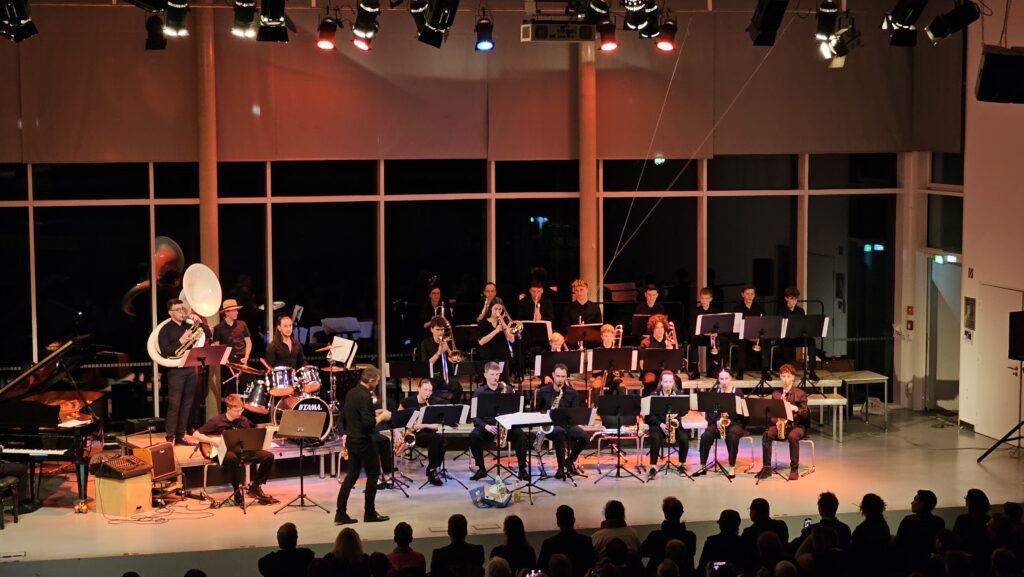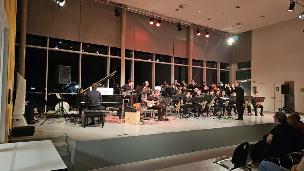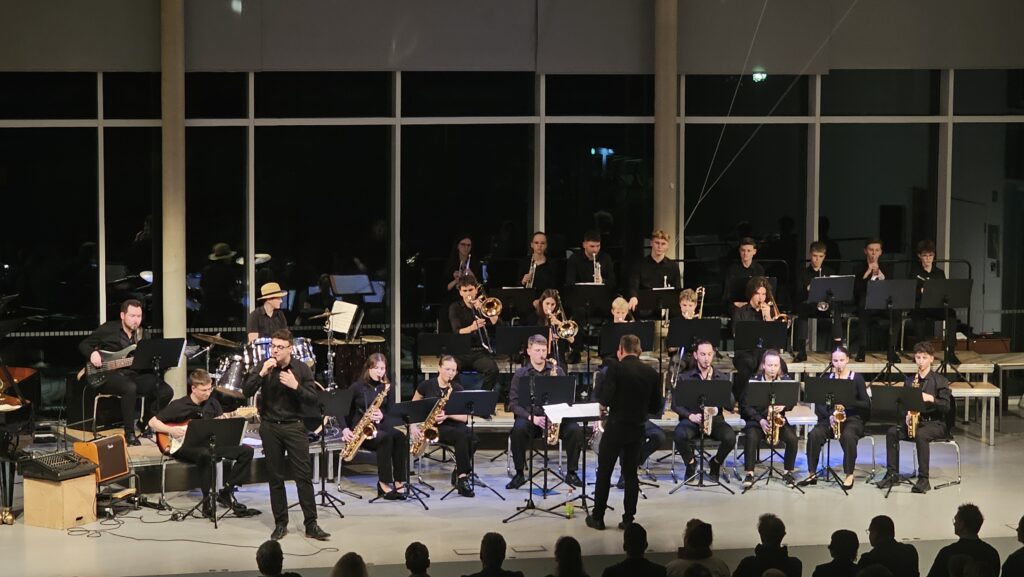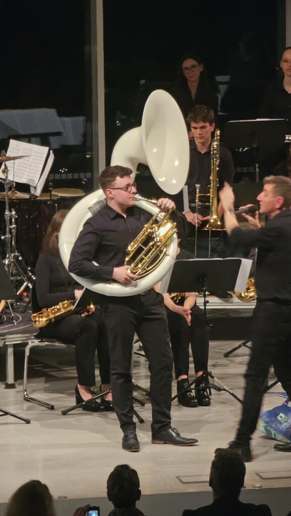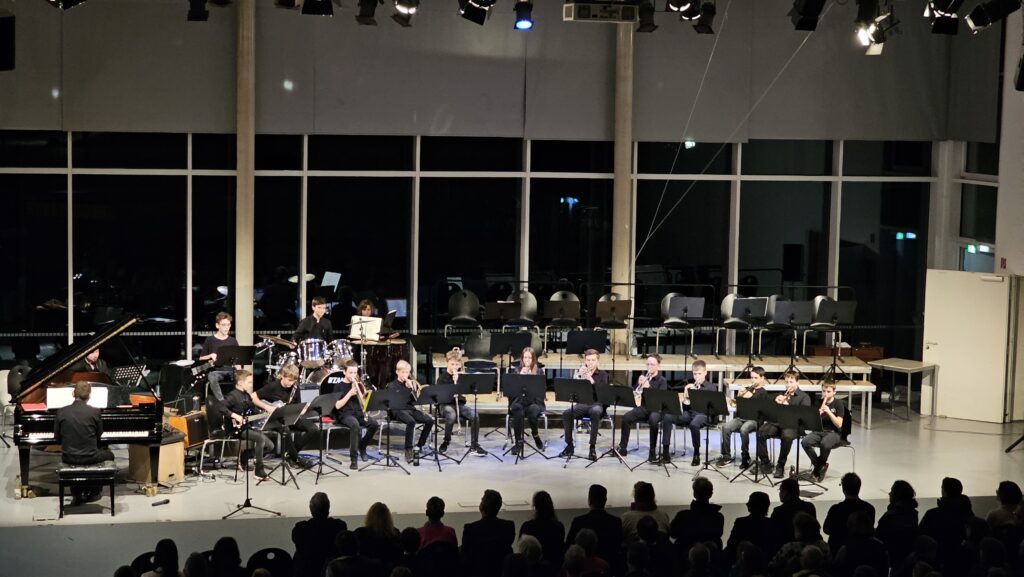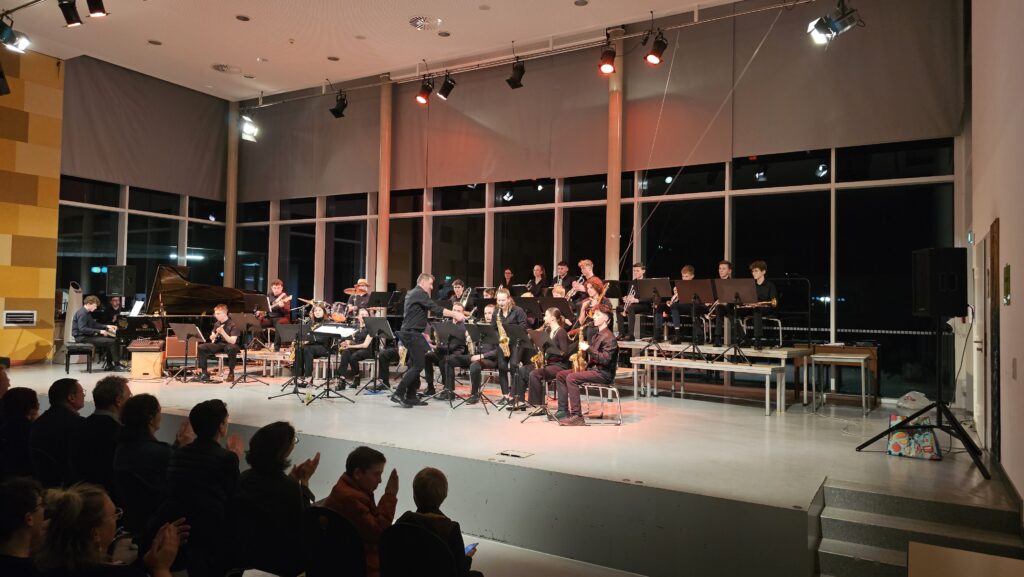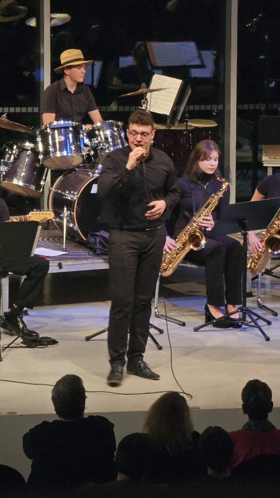 Dann übernahm die Big Band: mit 27 Musikerinnen und Musikern zahlenmäßig so groß wie noch nie. Und groß war auch die Abwechslung: Nach Elton Johns „I’m still standig“ und Gershwins „Strike up the Band“ erklangen mit „Don’t know why“ ruhigere Töne, wobei Laetitia Knosp wieder einmal durch ihr professionelles Gesangsolo überzeugte. Ein anderer alter Bekannter: Lucas Neps. Er buchstabierte nochmals singend die allgemeine Gefühlslage: „Feeling good“!