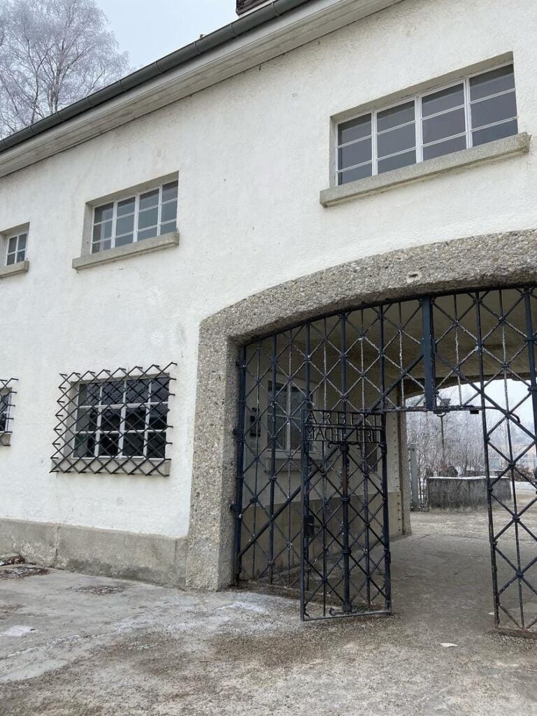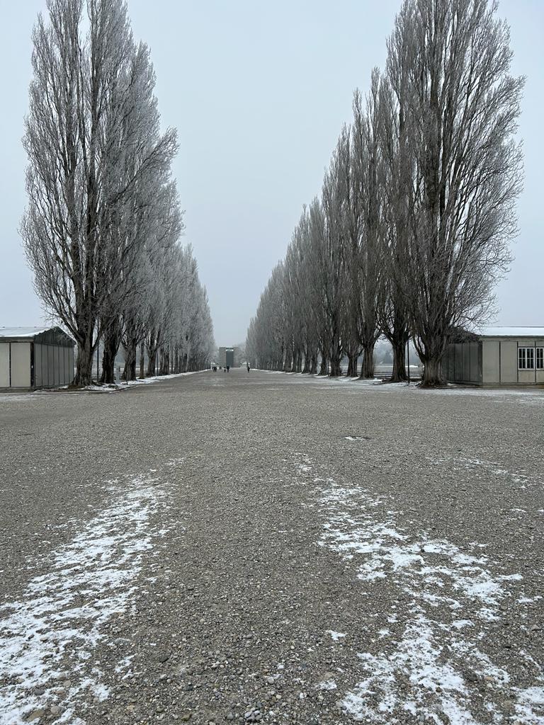 Am Tag des 11. Januar begab sich die neunte Klassenstufe des HöGy in die Gedenkstätte des Konzentrationslagers Dachau. Die Wetterbedingungen des Tages verstärkten die bedrückende Atmosphäre im Schatten der Gräueltaten der Nationalsozialisten umso mehr. Kalter Nebel lag in der Luft, Neuschnee bedeckte den Boden. Die Gefühle waren befremdlich als wir durch das bedrohlich wirkende Eingangstor mit der Inschrift “Arbeit macht frei” gingen. Von dort aus gelangt man auf den großen Appellplatz. Rechts davon befindet sich das von den Nazis als Wirtschaftsgebäude bezeichnete Gebäude zur Verwaltung und Versorgung der mörderischen Anlage. Links waren zwei nachgebaute Häftlingsbaracken zu sehen, dahinter die Fundamente unzähliger nicht mehr erhaltener Baracken. Getrennt werden die beiden Reihen der befremdlichen Holzhütten von einer augenscheinlich unendlichen Allee. Es ist kaum zu begreifen, wie Menschen so organisiert und in derartigen Dimensionen andere Menschengruppen quälen und teils schließlich sterben lassen können.
