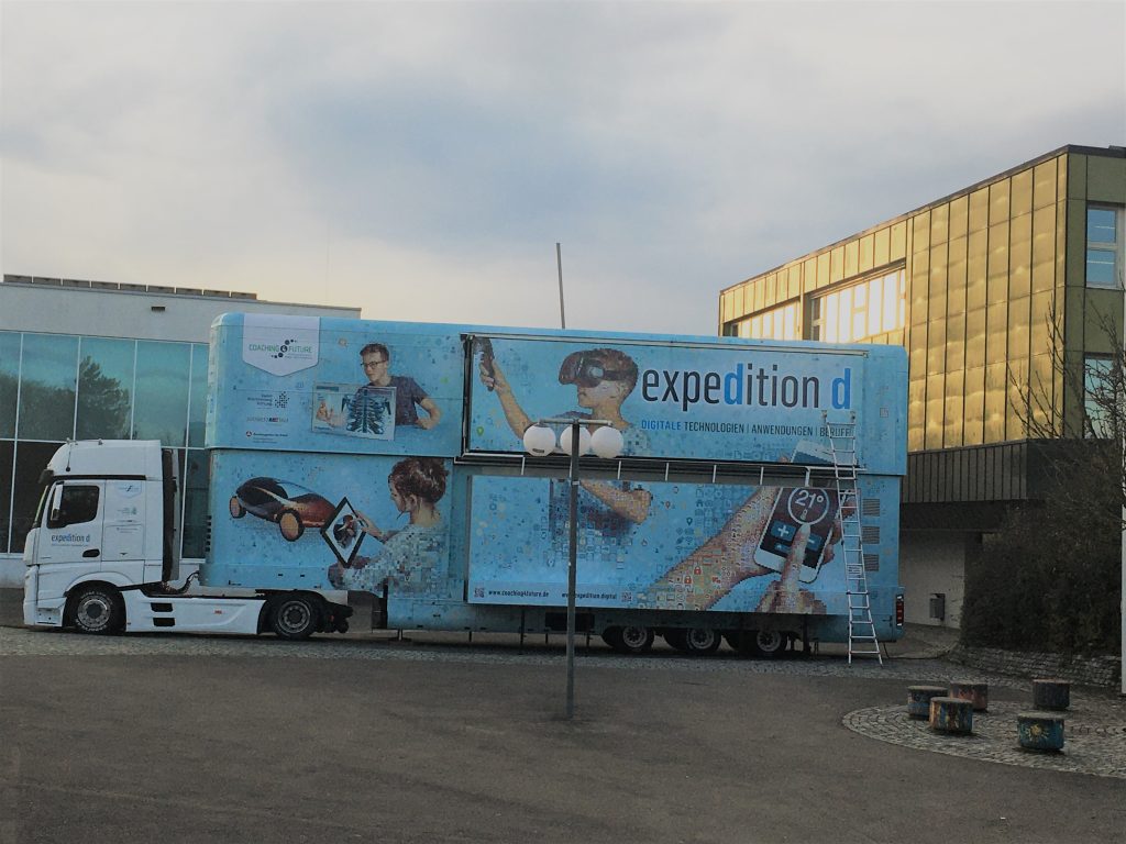 Wie kann ein Auto autonom fahren? Wie werden wir im Jahr 2025 lernen? Welche Berufe wird es dann geben und welche digitalen Kompetenzen werde ich dafür brauchen? – Die Bildungsinitiative expedition d – Digitale Technologien | Anwendungen | Berufe gibt Antworten und Orientierung für die digitalisierte Arbeitswelt. Ein Erlebnistruck, voll bepackt mit digitalen Technologien, macht dazu an weiterführenden Schulen in ganz Baden-Württemberg Station. Die Jugendlichen erleben im Mobil, welche Rolle die MINT-Fächer Mathematik, Informatik, Naturwissenschaft und Technik für die Digitalisierung spielen, wie diese die Berufswelt verändert und wie sie selbst daran mitarbeiten können.