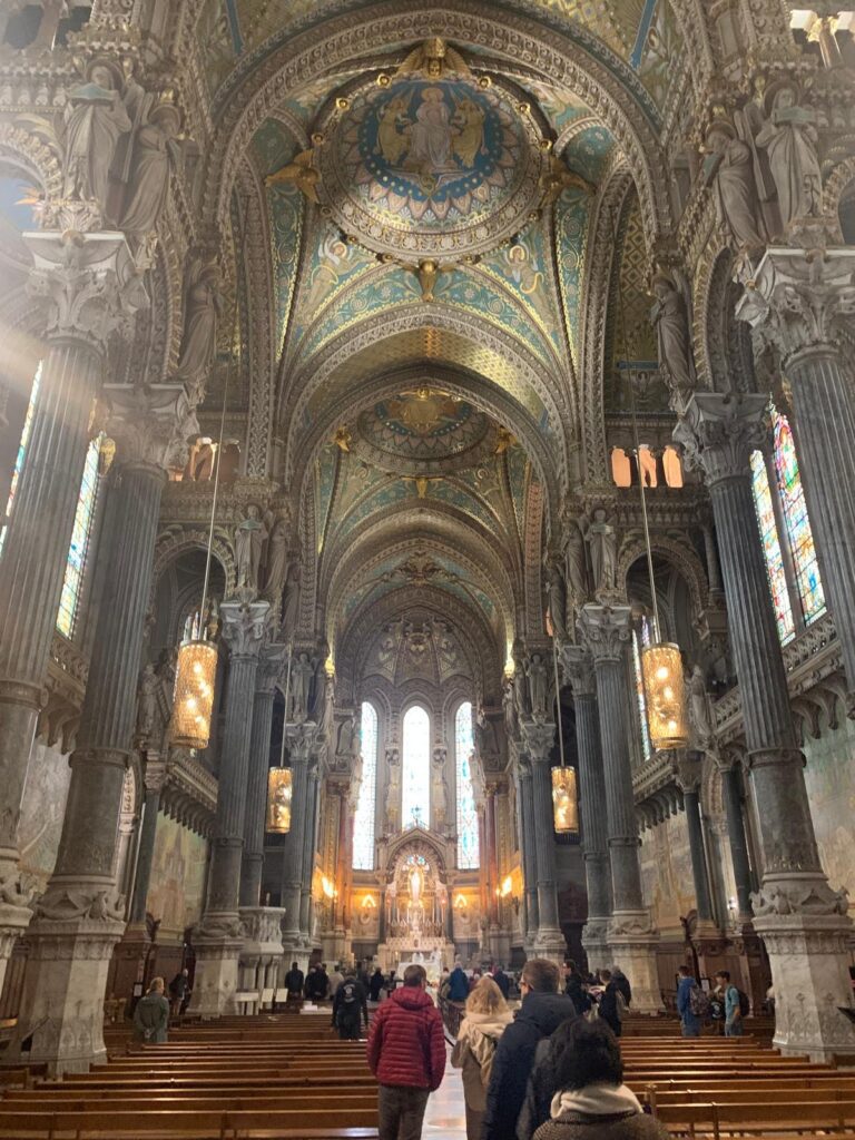 Unseren letzten Tag in Frankreich verbrachten wir teilweise im Unterricht unserer Austauschpartner. Wir empfanden es als interessant, die schulischen Unterschiede zwischen Deutschland und Frankreich zu entdecken und näher kennenzulernen. Der Schulleiter führte uns anschließend durch die historisch wertvollen Gebäude des Saint Thomas d‘Aquin. Als bedeutend fiel uns die Kapelle auf, die insbesondere die Kinder und Jugendliche der Schule ansprechen soll. Im Anschluss, bei unserem letzten Aufenthalt in Lyon, hatten wir mehrere Stunden Freizeit zur Verfügung. Einige gingen den Vorschlägen unserer Lehrerinnen nach und besichtigten beispielsweise ein Museum, das Filmrequisiten ausstellt, oder fuhren selbstständig mit der Métro in ein großes Einkaufszentrum.