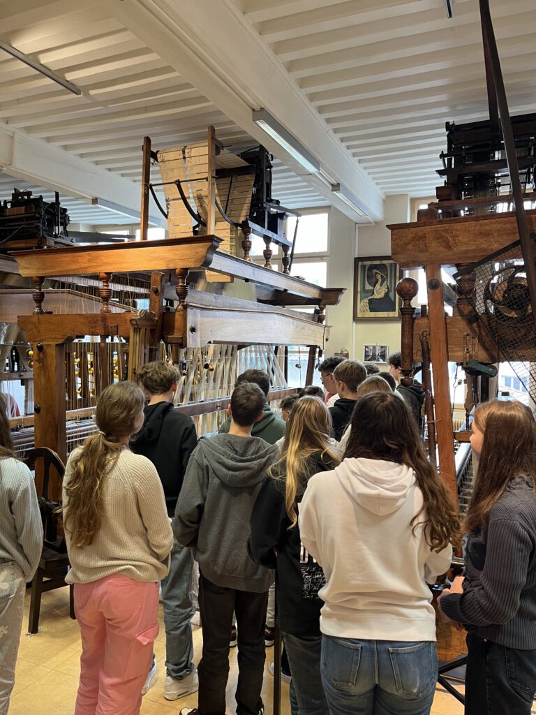 Am darauffolgenden Tag besuchten wir eine Weberei im Weberviertel Lyons, wo wir selbst am Webrahmen kreativ werden konnten. Bei unserem Spaziergang durch das Viertel kamen wir auch am „Gros Caillou“, der einer Sage nach das versteinerte Herz eines Steuereintreibers ist, vorbei. Aufgrund der schlechten Wetterbedingungen änderten unsere Lehrerinnen, Frau Karl und Frau Uricher, netterweise kurzfristig das Programm, sodass wir im Trockenen das Musée de l‘imprimerie et de la communication graphique besichtigen konnten.