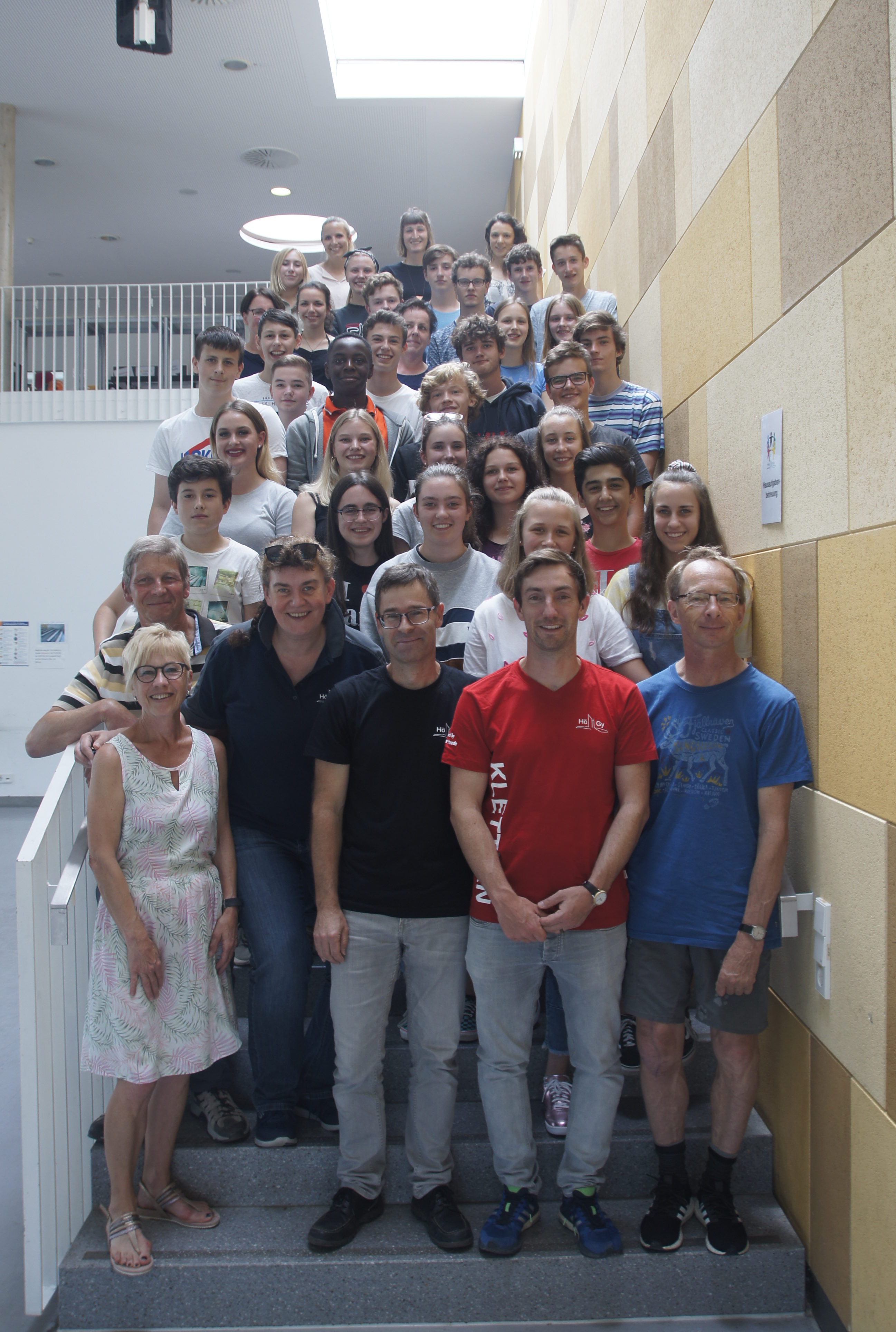 Mit einer launigen Rede bedankt sich Jörg Bauer bei allen Mitarbeiterinnen und Mitarbeitern der Ganztagesschule, eine „Ganz-Tolle-Sache“, wie er findet. Wie auch in den letzten Jahren lud das GTS-Organisationsteam alle Helfer kurz vor den Sommerferien zum gemeinsamen Pizzaessen ein und überreichte allen ein kleines Geschenk als Dank für ihr Engagement. Auf dem „Gemeinsamen-Treppen-Schnappschuss“ sind ca. zwei Drittel aller Jugendbegleiter zu sehen. Auf eine erneut gute Zusammenarbeit und zahlreiche Teilnahme an unserem umfangreichen Programm im neuen Schuljahr freut sich das