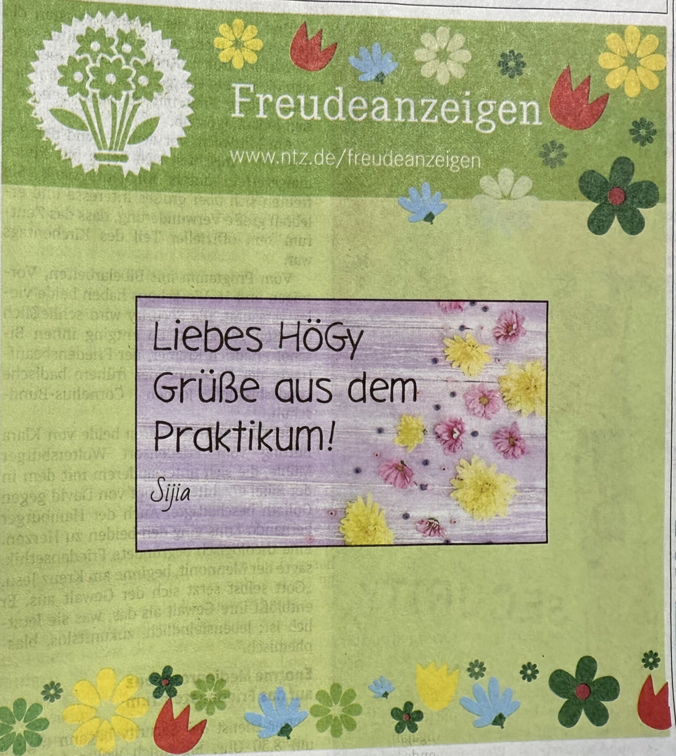 In der vergangenen Woche haben unsere Zehntklässler*innen im BOGY spannende Einblicke in die Arbeitswelt erhalten. Eine unserer Schülerinnen verbrachte ihr Praktikum bei der Nürtinger Zeitung und konnte einen Gruß an uns in einer Ausgabe unterbringen. Wir haben uns sehr darüber gefreut!