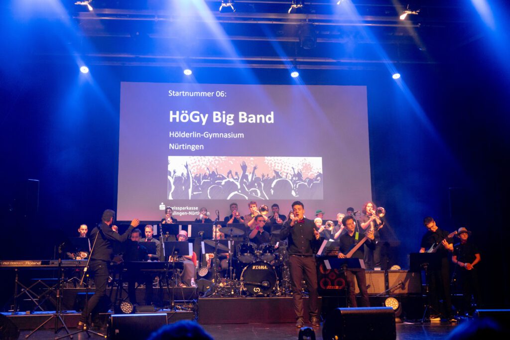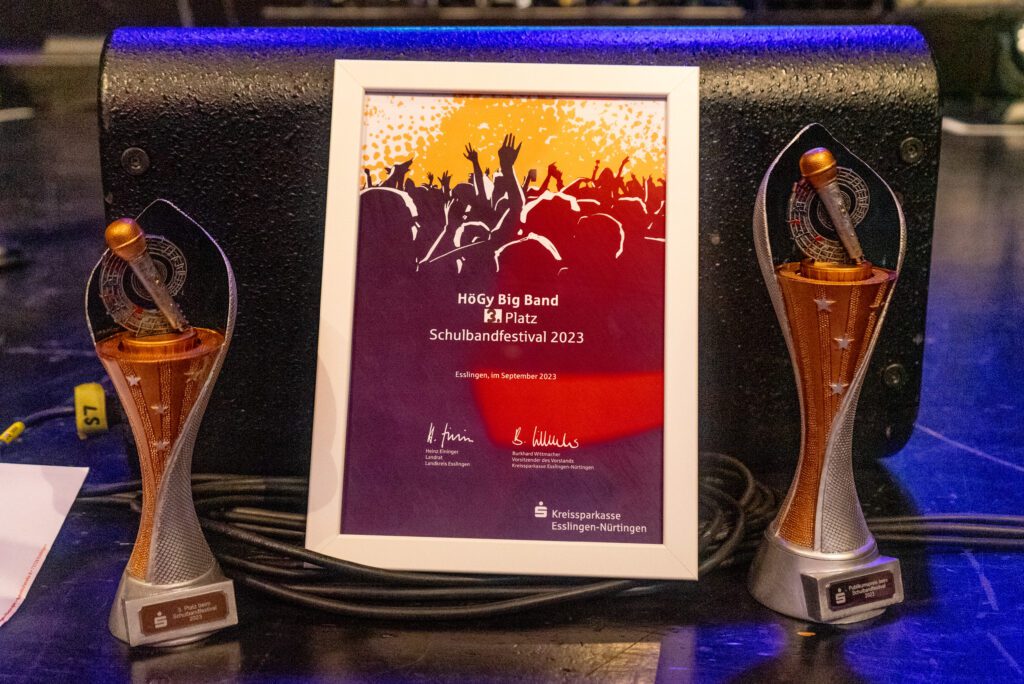 Auch unsere HöGy-Bigband war in diesem illustren Kreis dabei und konnte mit einer spektakulären Performance gleich zwei Preise abräumen: den dritten Preis im Wettbewerb (ein Studiotag inklusive Beratung im Wert von 2.500 Euro und 2.500 Euro zur freien Verfügung) und den Publikumspreis (ein Auftritt als Vorgruppe des Singer-Songwriters Pascal Blenke, der den Abend auch moderierte).