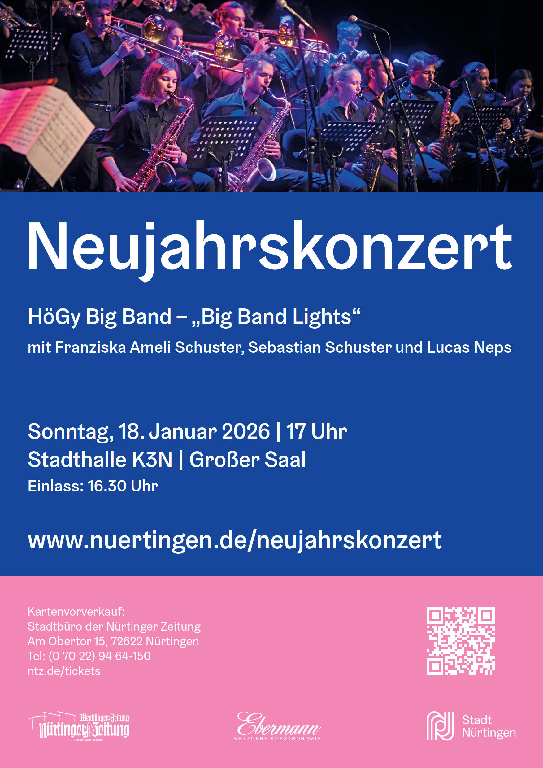 Die HöGy-BigBand darf am 18. Januar 2026 um 17 Uhr in der Stadthalle K3N das traditionelle Neujahrskonzert der Stadt Nürtingen gestalten.