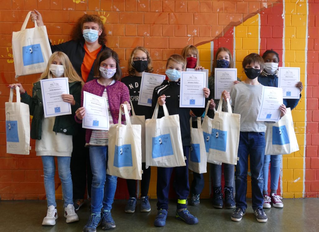 Die im letzten Schuljahr in Klasse 5 gestartete erste Runde ist jetzt abgeschlossen. Die jungen Kulturinteressierten erhielten nun für ihre kreativ gefüllten Kulturbeutel Preise, darunter Gutscheine für Eis oder Bücher. Und Pizza in kleinem Corona-gerechtem Kreis mit viel Abstand rundete die Ehrung ab.