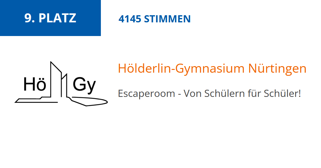 Das HöGy hat beim diesjährigen SpardaImpuls-Wettbewerb einen fantastischen 9. Platz (von 259 teilnehmenden Schulen in Baden-Württemberg!) erreicht. Damit erhalten wir ein Preisgeld in Höhe von 3.000€ für das aktuelle Projekt der HöGy-Talente-AG, die einen eigenen Escaperoom fürs HöGy erstellen. Nähere Infos dazu folgen bald – ihr dürft gespannt sein! An dieser Stelle gilt unser Dank allen, die fürs HöGy abgestimmt haben und dieses herausragende Ergebnis ermöglicht haben.