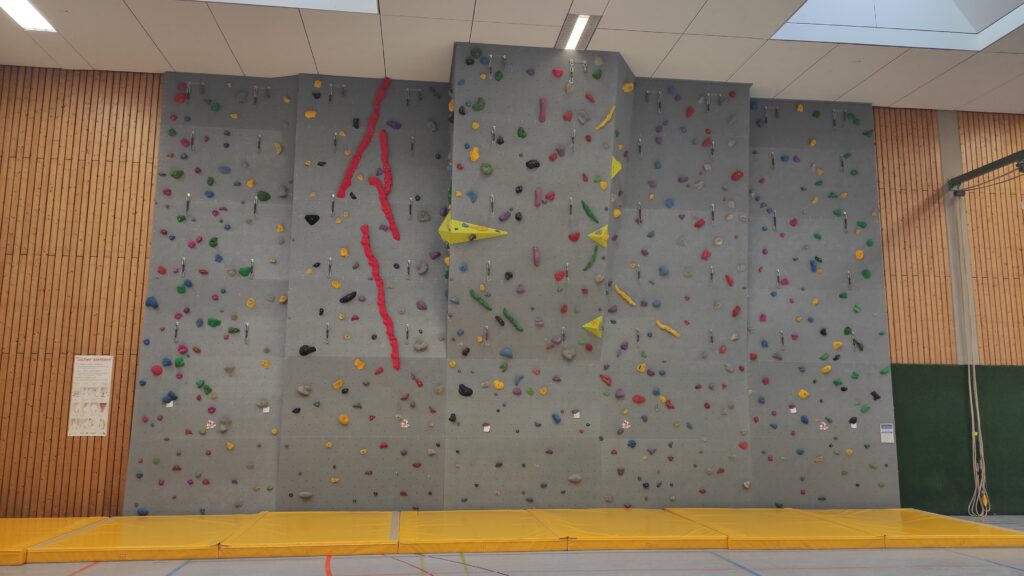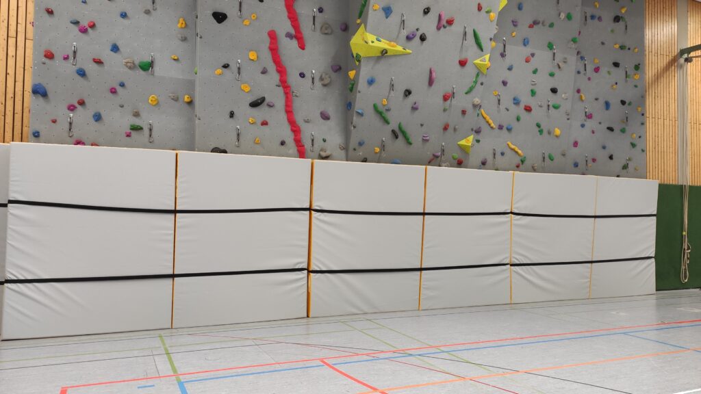 Seitdem die blauen Weichbodenmatten durch spezielle Bouldermatten, die den aktuellen Sicherheitsrichtlinien entsprechen, ersetzt wurden, wird die Kletterwand auch häufiger im Sportunterricht genutzt.