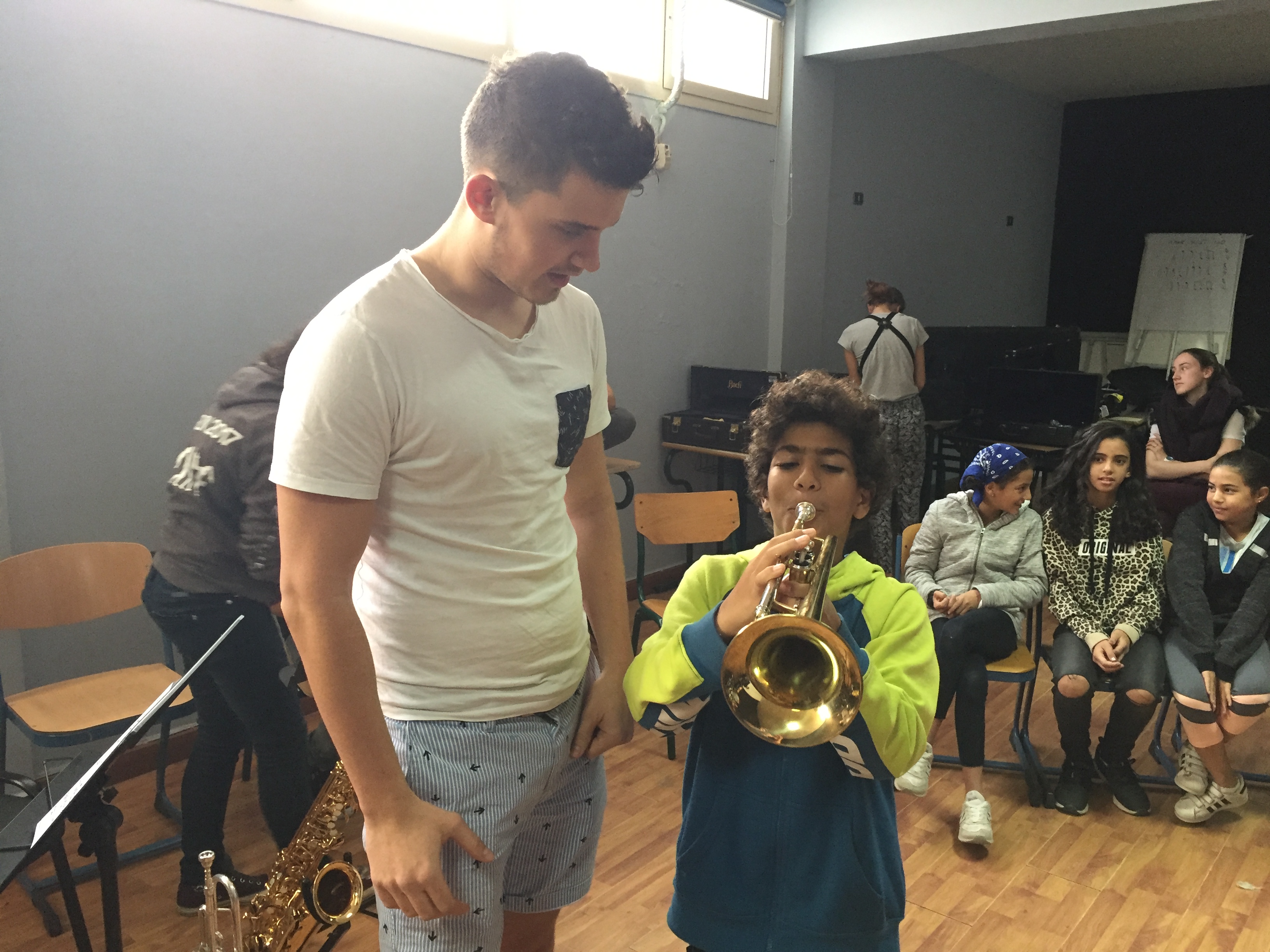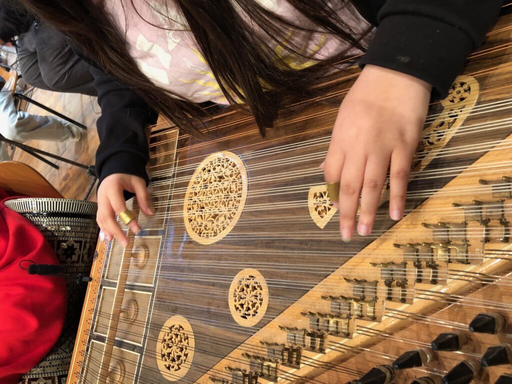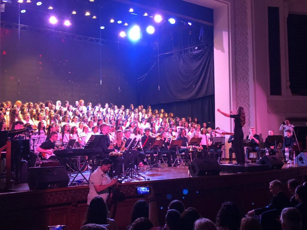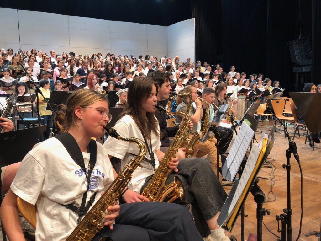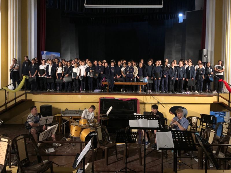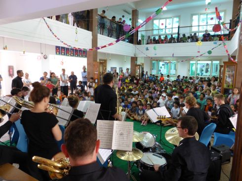 Das zweite Konzert in der vollbesetzten Eingangshalle des Gymnasiums stand ganz im Zeichen der musikalischen Begegnung. In gemeinsamen Proben wurden 4 Stücke gearbeitet, die dann den Schülern präsentiert wurden.