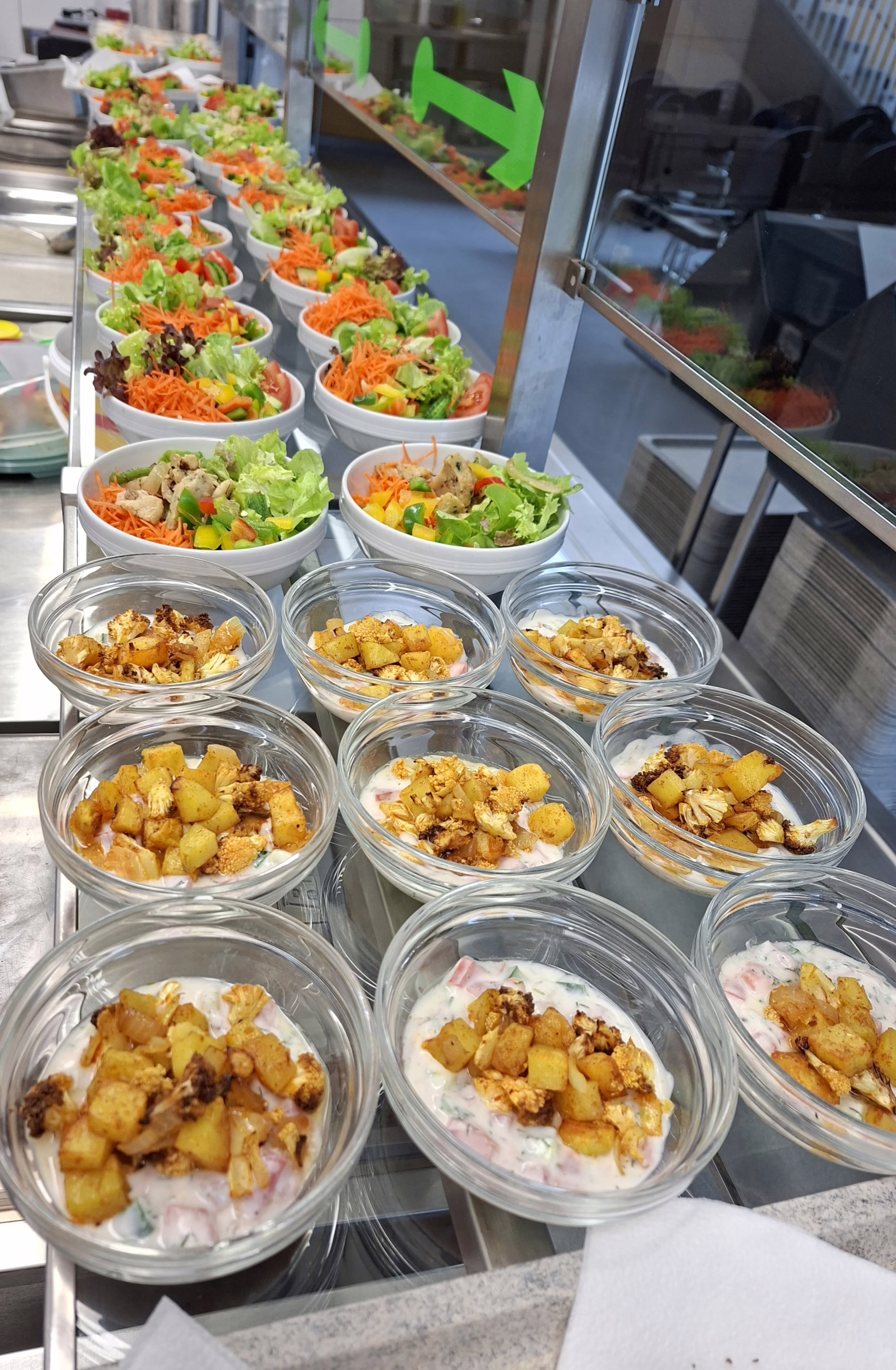 Die HöGy-Mensa zaubert jeden Tag frisch gekochte, gesunde Gerichte, bestehend aus Hauptgerichten, Salaten und Nachspeisen. Erfahrene Mitarbeiterinnen, welche die Speisen zubereiten, leiten die ehrenamtliche Helfer an.