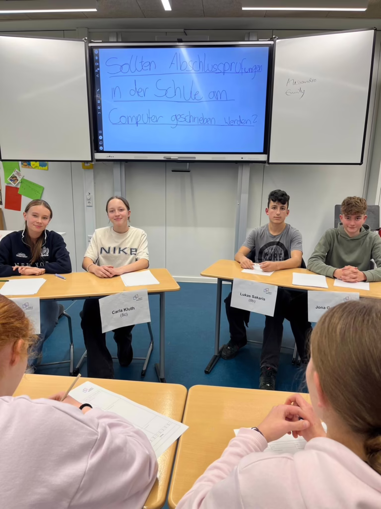 Nach den beiden Qualifikationsrunden blieben vierSchülerinnen und Schüler übrig, die sich nun mit der Streitfrage, ob alle Abschlussprüfungen in der Schule künftig auf dem Computer geschrieben werden sollten, auseinandersetzen mussten.