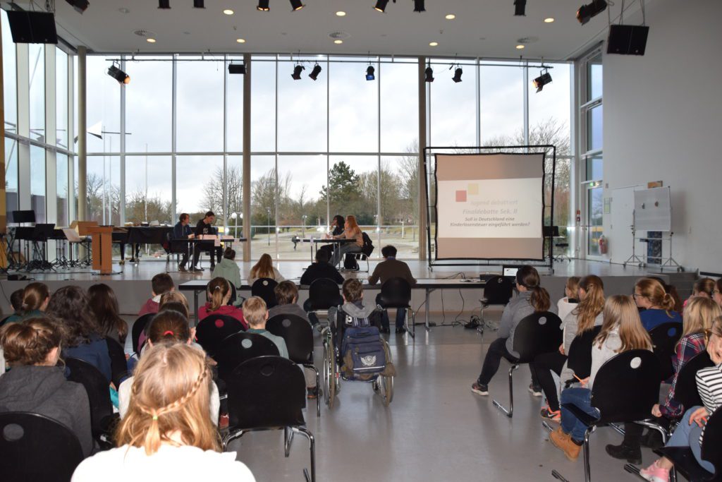 In fünf parallel stattfindenden Debatten der Klassensieger aus den Klassen 8 und Teilnehmern der Rhetorik AG konnten sich Franziska Fischer (8d), Jakob Stelzer (9e), Farah Rasool (9e) und Lukas Kley (8c) für das Finale der Sek.I qualifizieren. Auch die Klassen 7 wohnten dem “stürmischen Treiben”