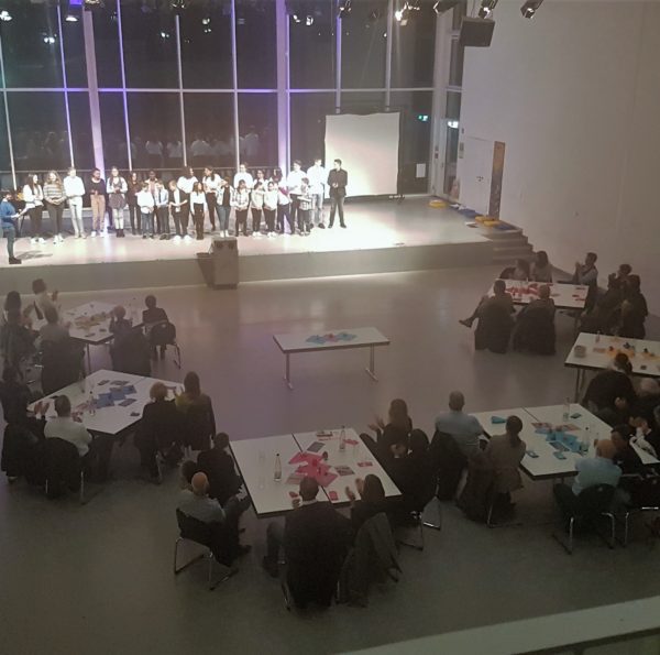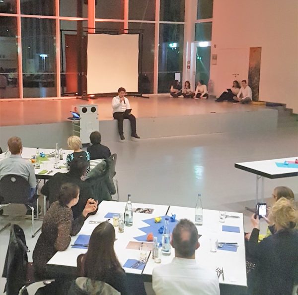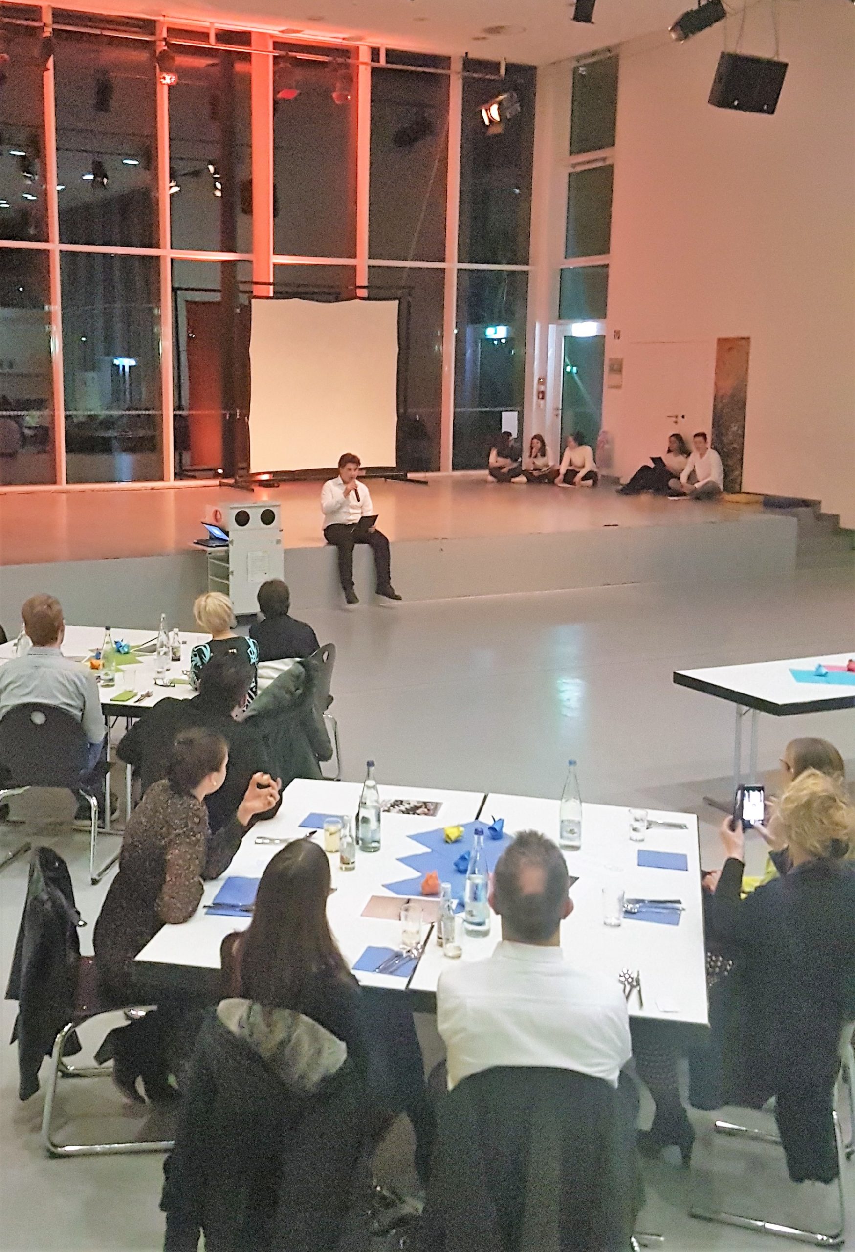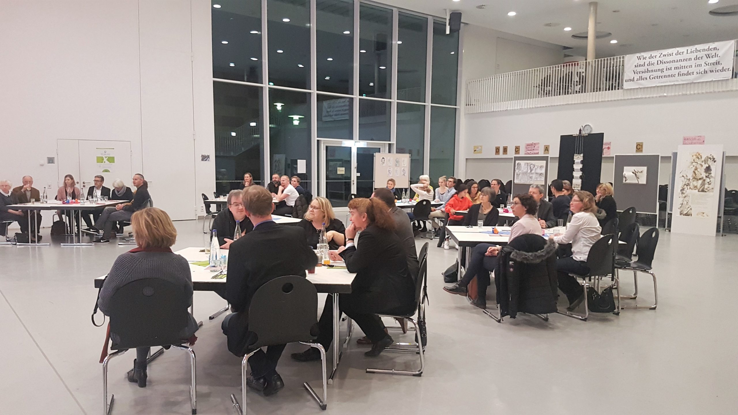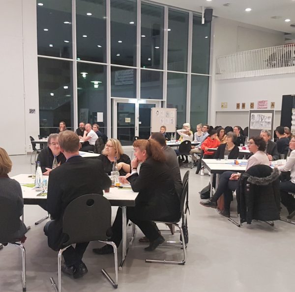 Bereits beim Betreten der Mensa konnten die Gäste sich auf den besonderen Abend einstimmen, denn die sonst in Reihe stehenden Tische waren in einem Halbkreis zur Bühne ausgerichtet und ansprechend dekoriert und eingedeckt. Auch die unter der Leitung von Frau Annette Kliss angefertigten Kunstprojekte luden zur Auseinandersetzung mit dem Namenspatron ein.