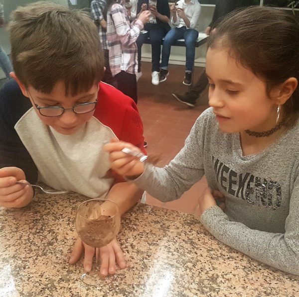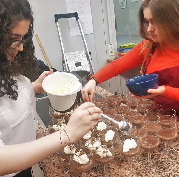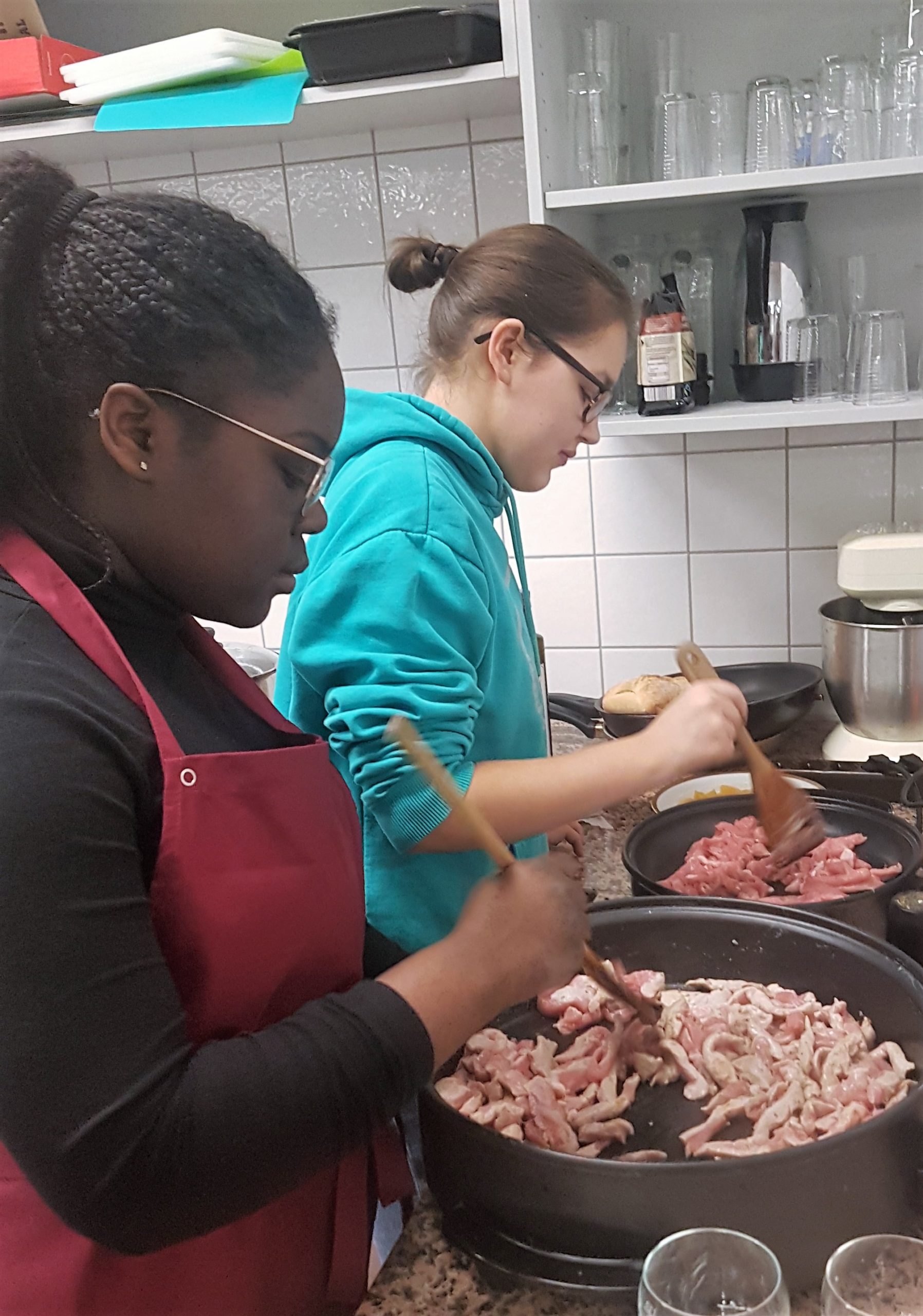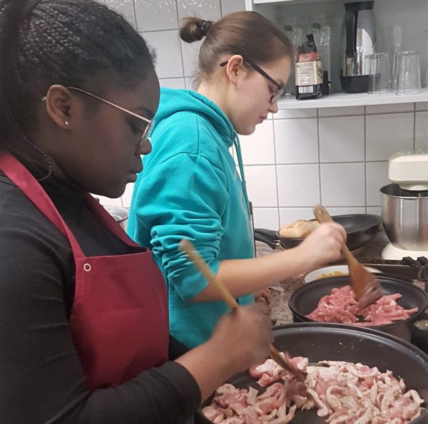 Während die kleinen Köche an diesem Abend den Service übernahmen und ihre Gäste zu deren vollsten Zufriedenheit umsorgten, kochten die großen „Schneebesen“ ein durchaus anspruchsvolles Vier-Gänge-Menü. Damit bewiesen sie, dass sie in der Koch-AG einige Fähigkeiten erworben hatten und konnten durch ihre hervorragende Organisation und unter vollem Einsatz mit allen Gerichten überzeugen. Angefangen bei drei herzhaften Aufstrichen über eine klassisch schwäbische Flädlesuppe und einem schmackhaften Hauptgang aus Pfirsich-Geschnetzeltem auf Nudelbett mit Preiselbeersahne bis hin zu einem selbstgemachten Zartbitterschokoladenpudding und einem verführerischen Himbeerschichtdessert.