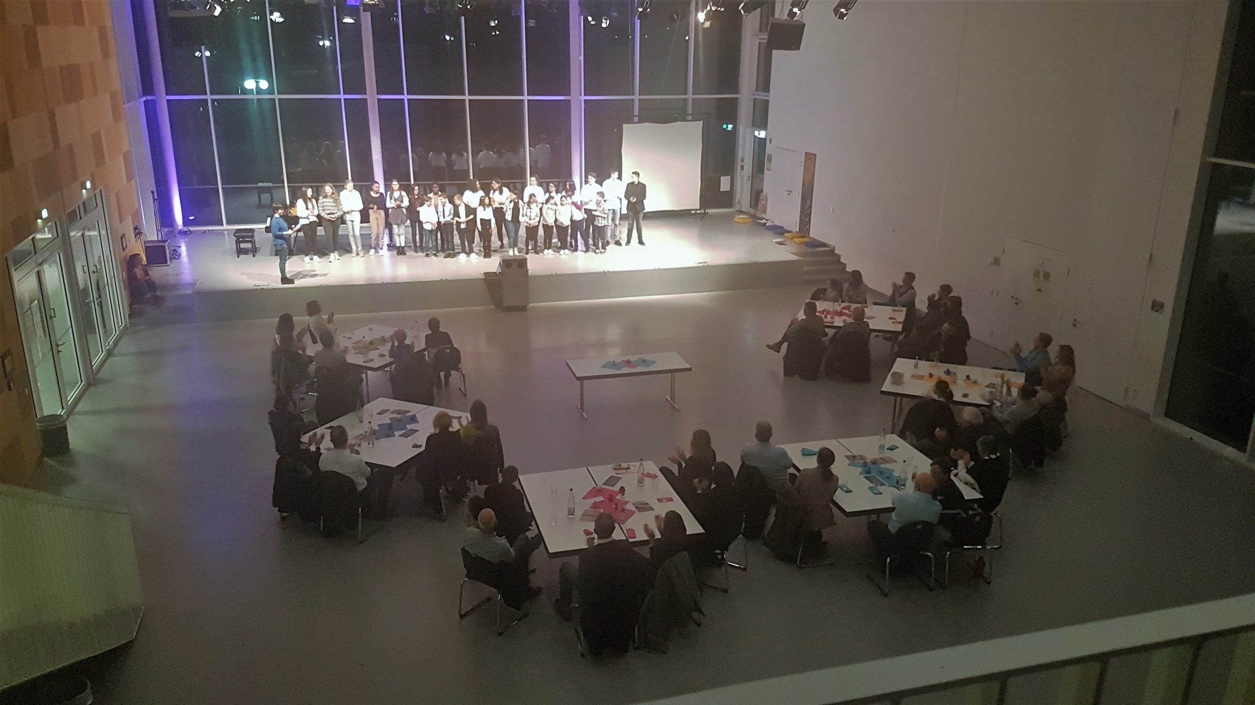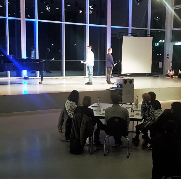 Insgesamt bot der Abend einen tiefen Zugang zu Friedrich Hölderlin und seinen geistigen Erben. Ganz in diesem Sinne schloss der Abend mit einem von Frau Annette Kliss eingebrachten Film, der Friedrich Hölderlins Verse und Denken in Szene setzte, sowie einer gemeinsamen Performance der gesamten Schreibwerkstatt zu Wilhelm Buschs Gedicht „Wie wohl ist dem, der dann und wann“, auf welches eine kurze Dankes- und Abschiedsrede für die mitwirkenden Schüler*innen folgte, bevor sich diese den mehr als verdienten Beifall vom begeisterten Publikum abholten.