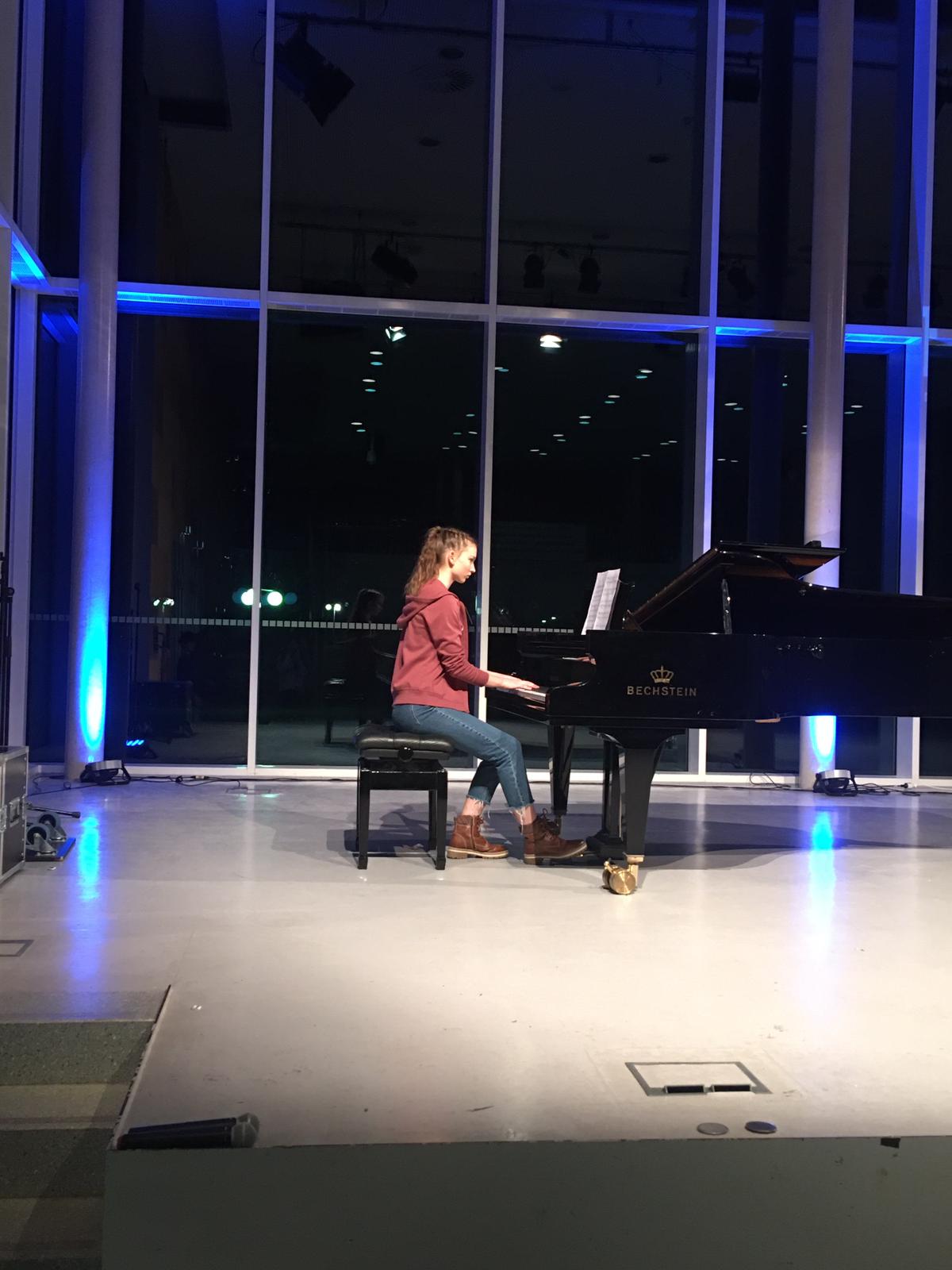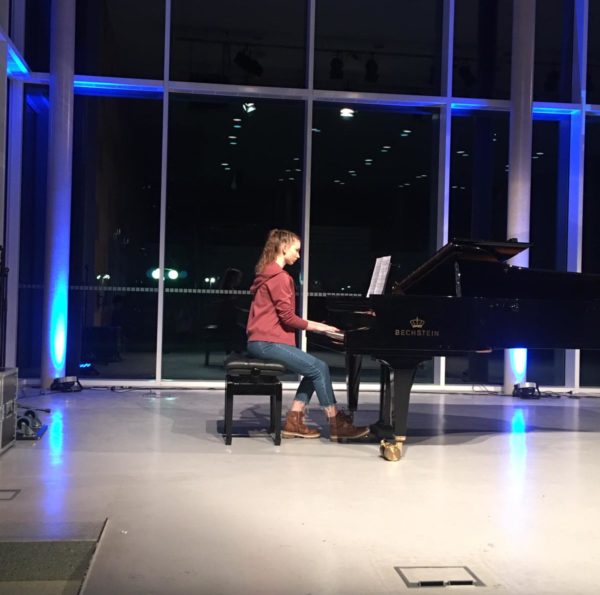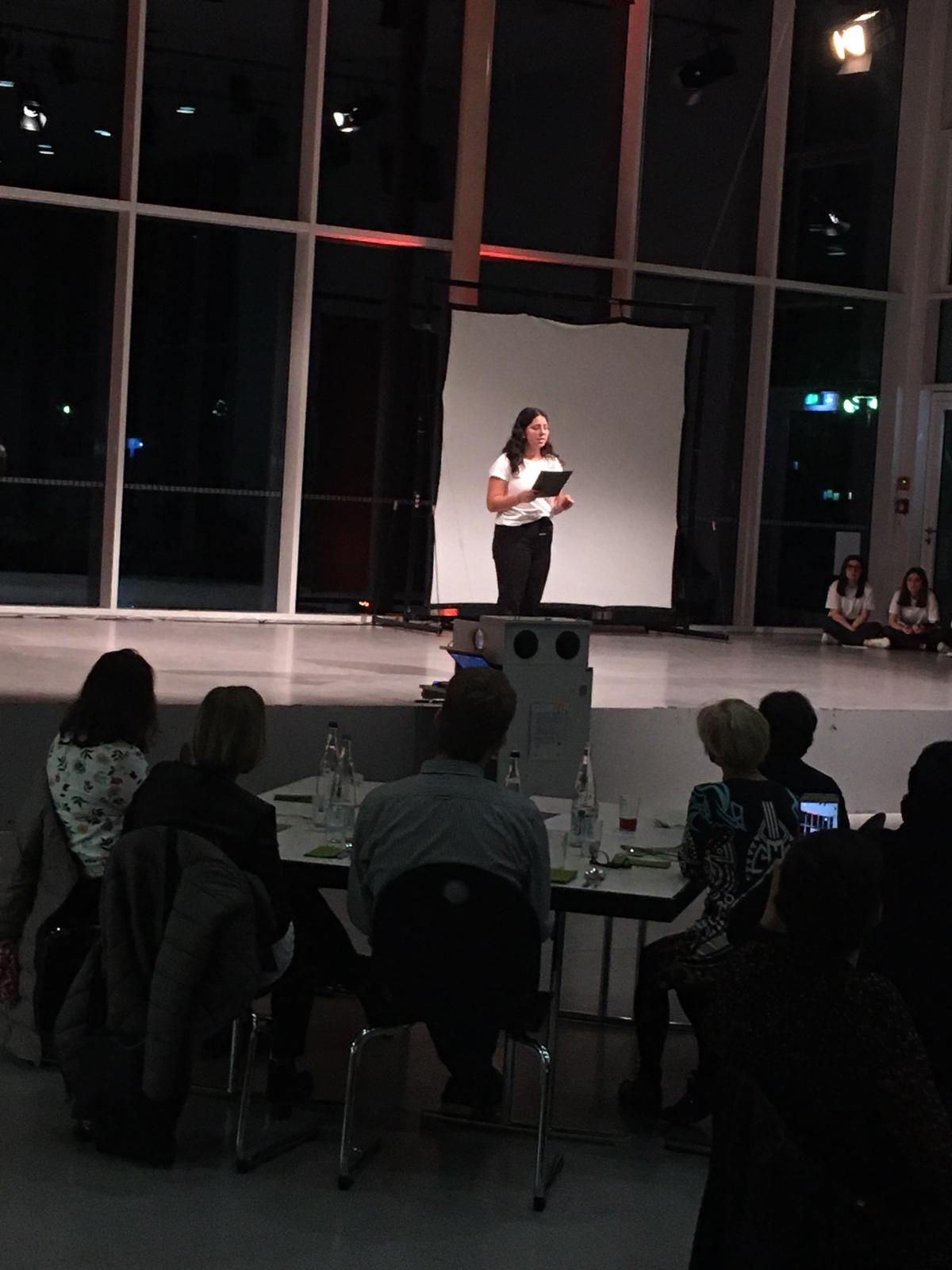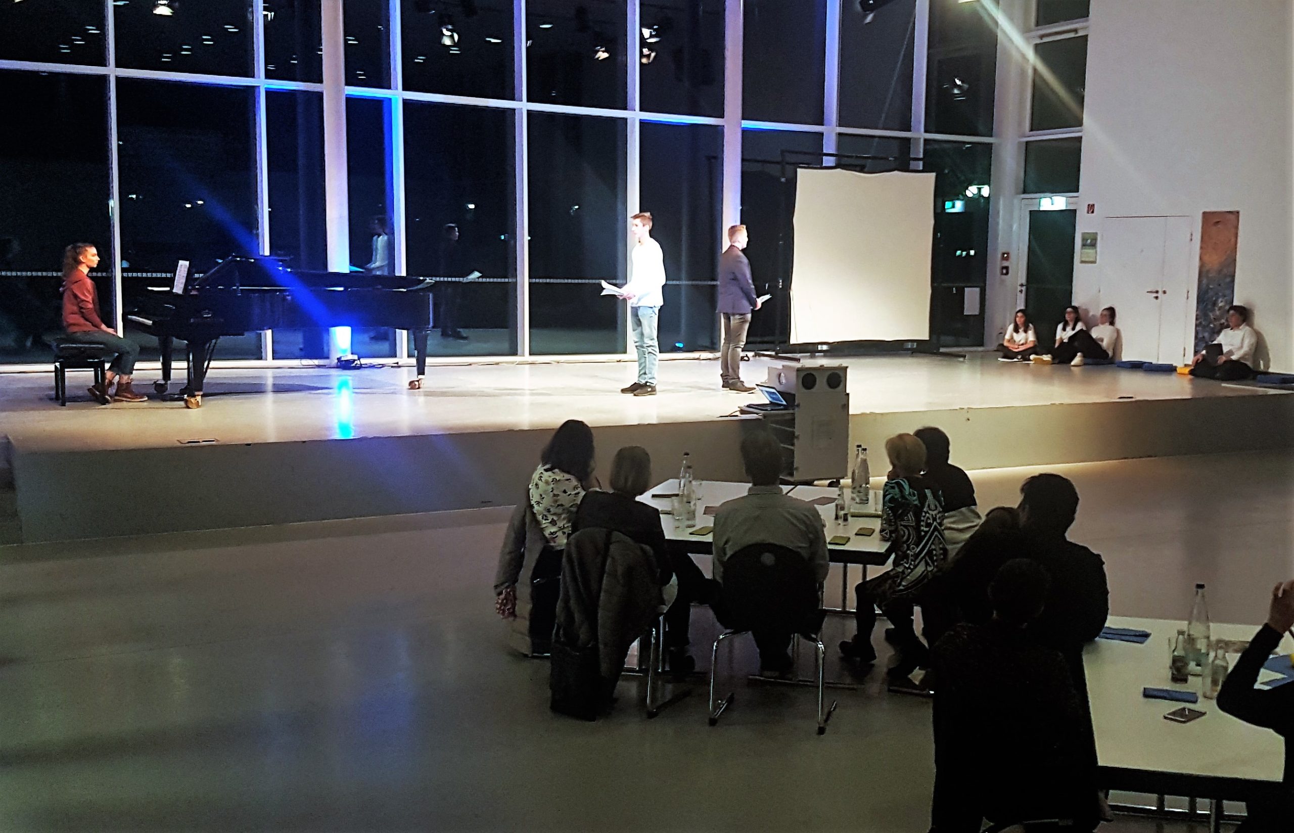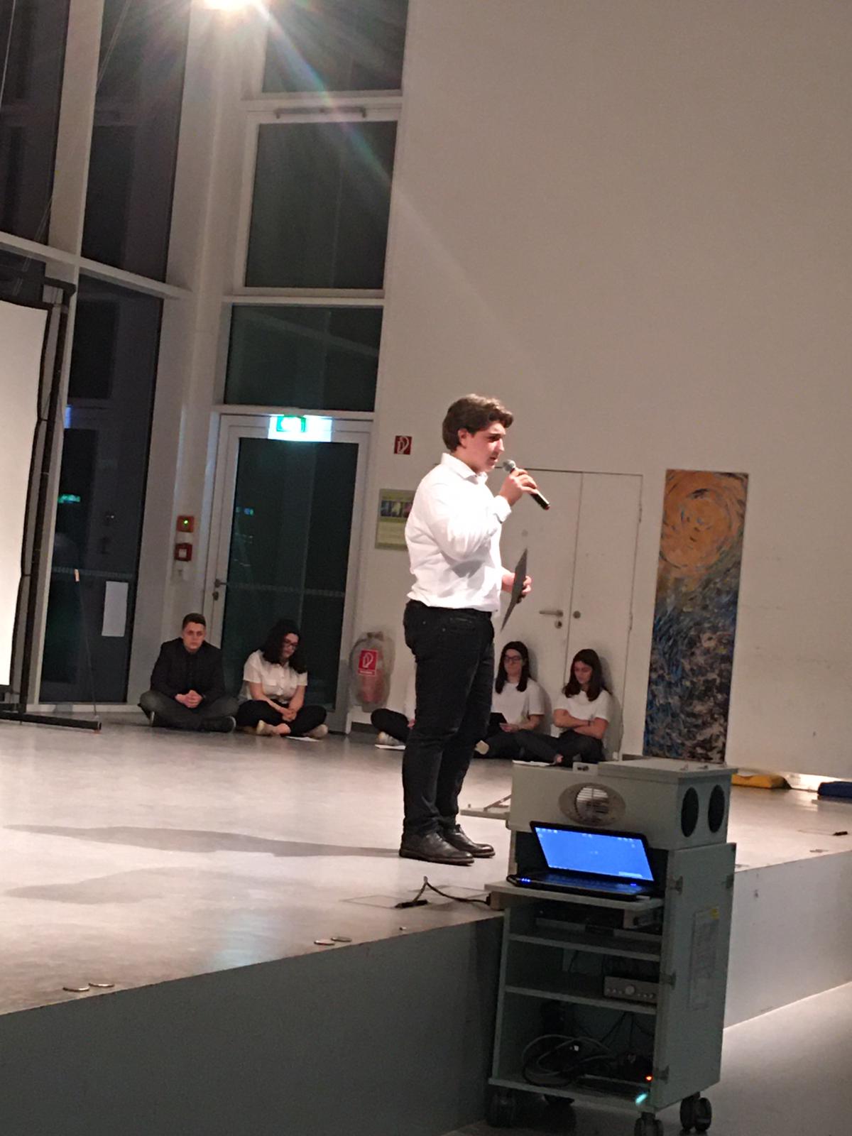 Das Zentrum des Abends bildeten die literarischen Darbietungen der Schreibwerkstatt, die mit der Rezitation einiger Hölderlin-Gedichte, Gedichten über Kunst und eigenen Werken die Kunst selbst in den Fokus nahmen und mit eigenen Akzenten in der Performance versahen. So eröffnete Gizem Turunc das Programm mit der „Feier des Wortes“ von Axel Kutsch und rief die Zuhörer auf, sich dem Gedicht mit angemessener Haltung zu nähern. Fabienne Grigat, Baftisha Berisa und Jette Kopschinski hingegen wanden sich mit einem Gedicht Friedrich Hölderlins „An die jungen Dichter“. Ceyda Yüksel wiederum lud das Publikum unter anderem zu einem Gedankenspaziergang ein, wohingegen Luca Swoboda und Nicolas Herden zunächst in ihren Texten auf die Bedeutung der Kunst und die Freiheit des Künstlers hinwiesen, dann jedoch auch Hölderlins Gedicht „Lebenslauf“ in Szene setzten und die darin hervorstehenden Licht- und Schattenseiten des Lebens klar verdeutlichten. Constantin Demattio wies die Anwesenden auf das Bewusstsein eines jeden benutzten Wortes und die Macht der Sprache hin, bevor er später das Sonett 18 von William Shakespeare gefühlvoll vortrug und schließlich in seinem eigenen Text „Blau mit Streifen“ seine Gedanken zur modernen Kunst darbot. Die Highlights bildeten klar die von den Schülern selbst verfassten Texte.